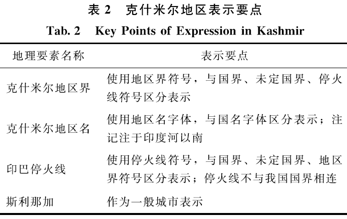 3)克什米尔地区。克什米尔地区属世界热点争议地区,为体现我国对该地区的基本外交观点,公开地图应对克什米尔地区留白。如图名为印度全图或巴基斯坦全图,应将克什米尔地区绘制完整。其地区名、地区界、主要城市等地理要素的表示要点如表2所示。