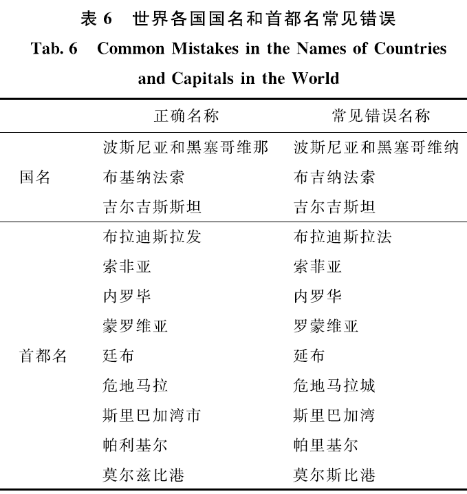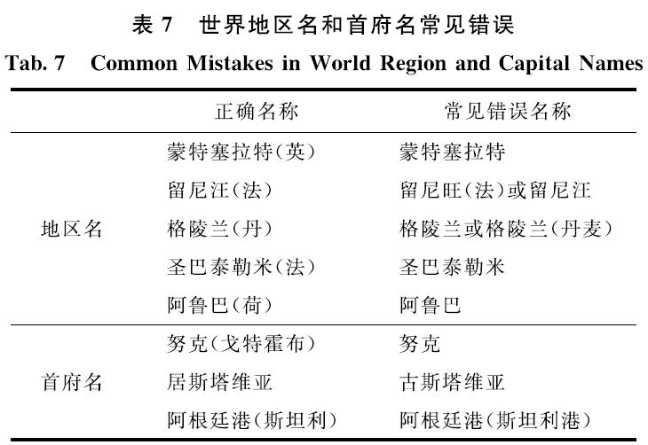 1)地区名和首府名。西撒哈拉、法属圭亚那等地区名应当准确表示,不将地区名表示为国名。常见错误如表7所示。
