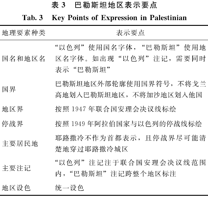 1)巴勒斯坦地区。为体现我国的基本外交观点,巴勒斯坦地区的国名和地区名、国界、地区界、停战界、主要居民地、主要注记和地区设色的表示要点如表3所示。
