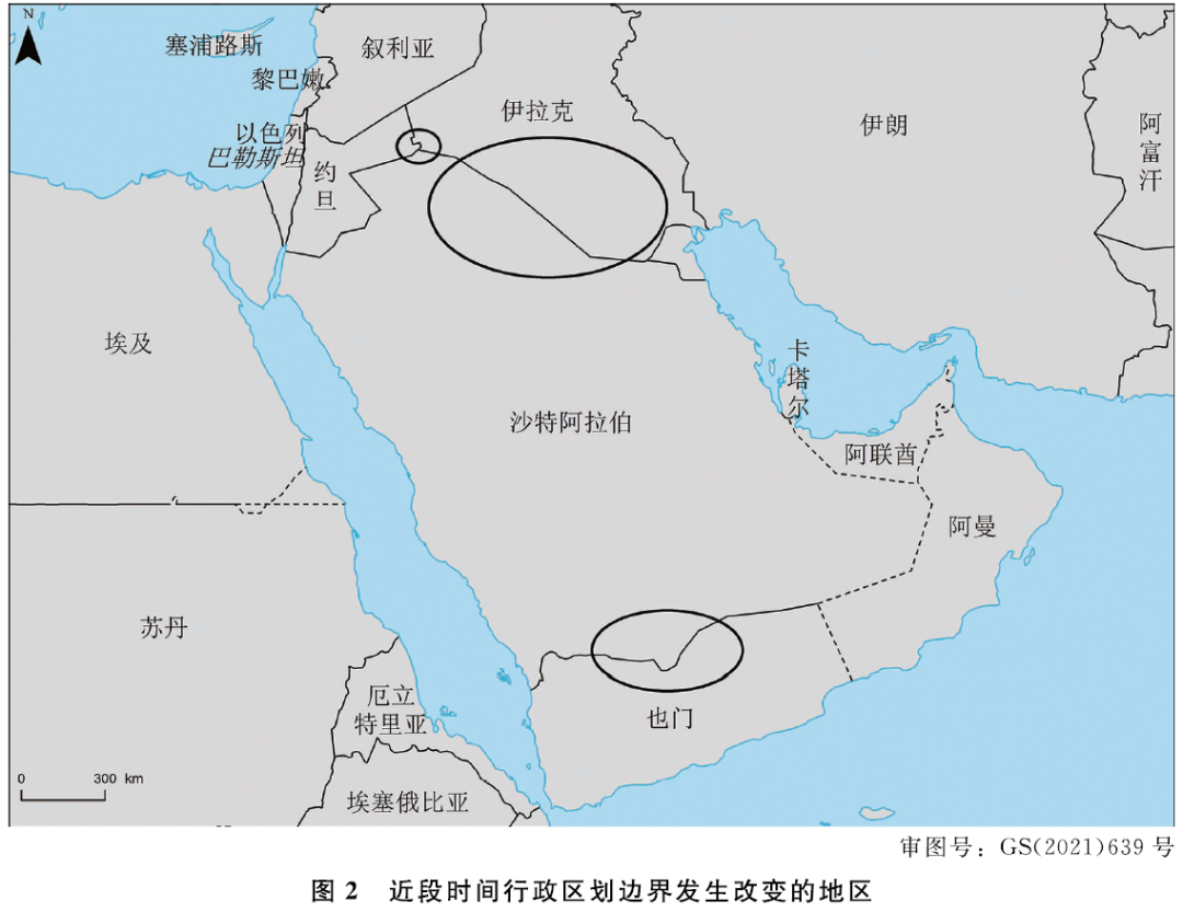 图2共存在3组界形走向发生改变的国界:约旦-伊拉克、伊拉克-沙特阿拉伯、沙特阿拉伯-也门。绘制公开世界地图时,应将上述国界走向绘制准确。