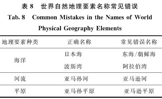 为符合我国的外交观点,世界部分海洋、河流等名称需要准确表示,常见错误如表8所示。