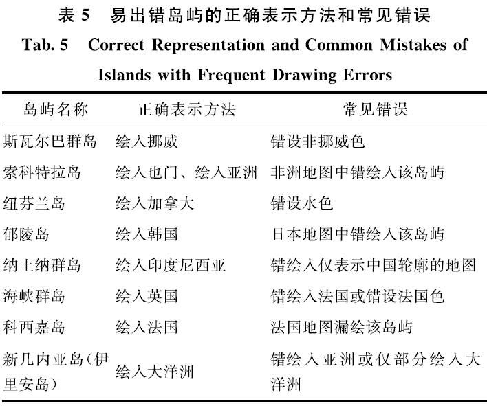 2)易出错岛屿。根据世界各国国界线画法参考样图,结合实际工作,归纳出各重要岛屿表示的易错点,主要包括错设非所属国家或大洲底色、错绘入他国等,如表5所示。