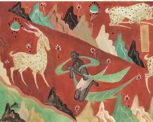 除了将鹿王身上的点状花纹换成月牙形,动画几乎完全还原了壁画——整个画面以人物为主,土红色的大地衬以山石树木,有浓厚的装饰风格。甚至于路边的花草,也都一模一样。