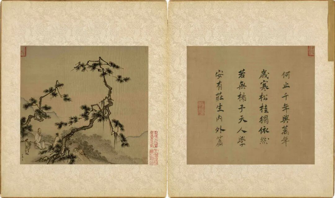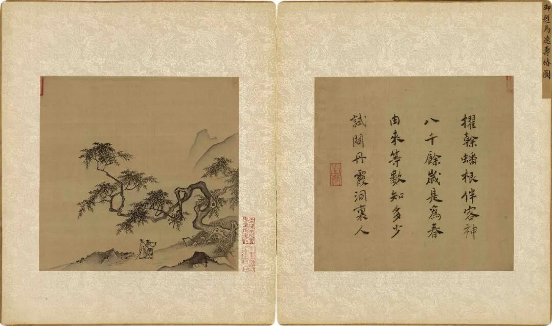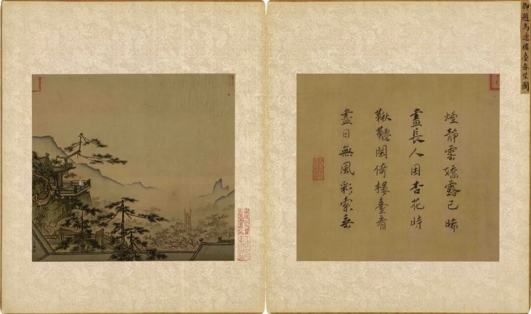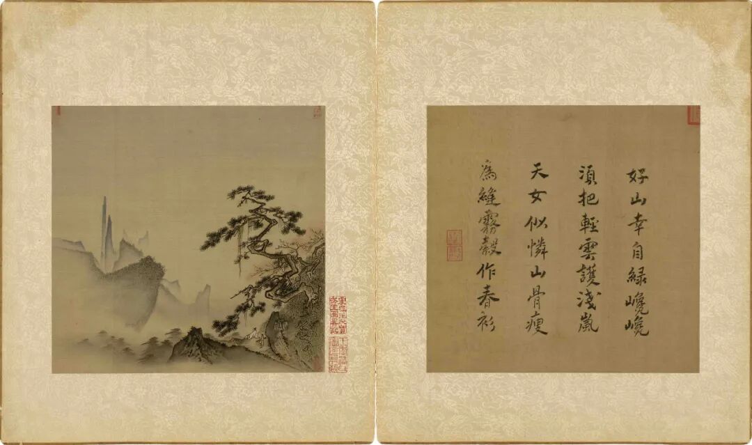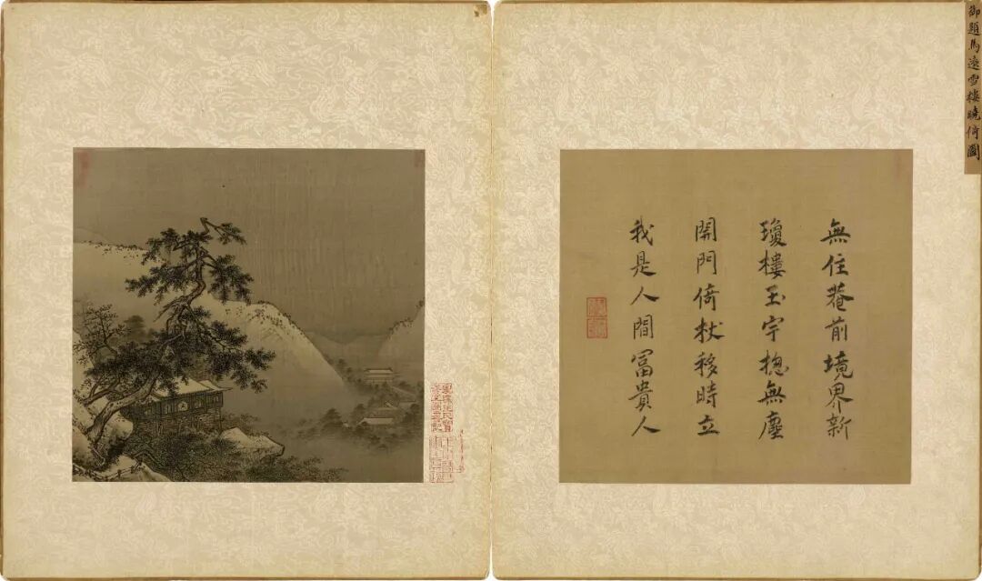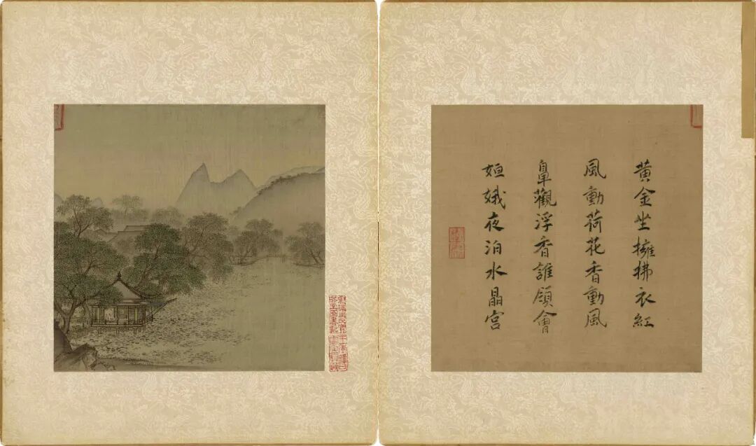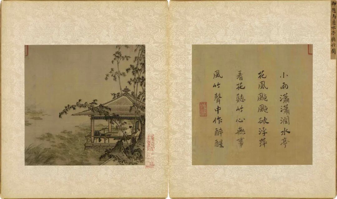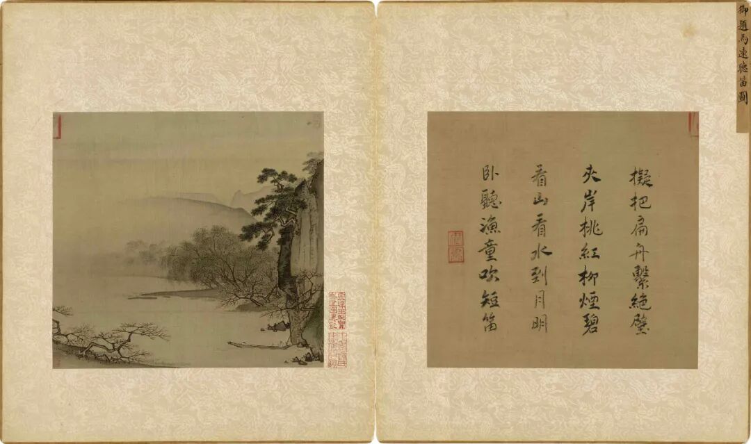 此套马远山水册,封面包落花流水纹绫。签条书《御题马远山水册》。册宽37厘米,高44厘米,画心宽28厘米,高27厘米。计十开,右半开为书法,左半开为绘画,无题跋。![]()