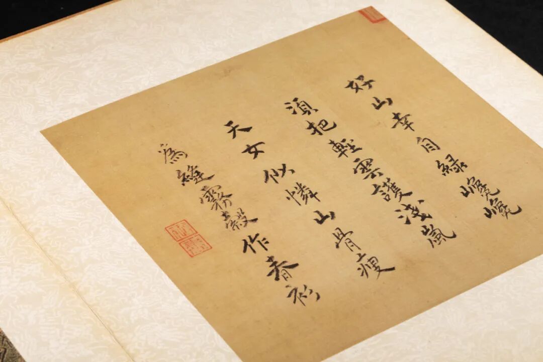 绘画作者马远(1140—1225),字遥父,号钦山。祖籍河中(今山西永济),生长于临安(今浙江杭州)。光宗、宁宗时任画院待诏。马远出身绘画世家,曾祖马贲、祖马兴祖、伯马公显、父马世荣、兄马逵、子马麟等皆为宋代知名画家,马氏一门五世盛誉两宋。田汝成(明)《西湖游览志》称“(马远)师李唐,布景齐整,工山水、人物、花鸟,种种臻妙,独步画院。”马远绘画风格独特,富有诗意。其山水画构图有较强的个人风格,主景常集中于画幅对角线下侧,故有“马一角”之雅号,气格典雅高华。人物画用笔凝重含蓄,开脸端庄,衣纹多用他的画树枝的拖枝笔法描绘,微带颤动断续,风格古雅。他手法新奇,构思巧妙,长于表现特定的气氛和瞬时的情态。紧紧抓住繁密的一角,表达出极尽精微的细节,同时放下大块留白,让读者驰骋想象。技术与艺术的结合让他“独步画院”,与李唐、刘松年、夏圭并称南宋四家,又与夏圭并称“马夏”。“马夏画派”成为南宋画院主流画派,形成中国绘画上一个重要的高峰时期,影响后世数百年。经专家鉴定比对,该册页中十幅书法作品的风格、结体,与马远《踏歌图》(故宫博物院)、马远《松寿图》(辽宁省博物馆)以及马远《华灯侍宴图》(台北故宫博物院)上宋宁宗的御题一致,为宋宁宗御笔无疑。十幅绘画中有五幅署马远款,其余无款,皆为典型的南宋院体画风格,且用笔统一,设色协调,风貌一致,疑为同一人作。![]()