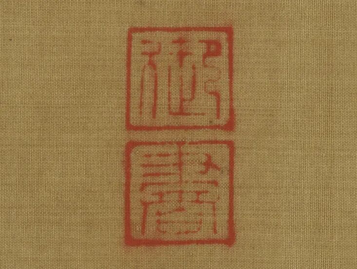 这幅高水准佳作,依其典型的风格毫无疑问属出于马远。而且,五幅画上有马远的落款,并且冠以“臣”字款,与存世其他作品相同。最有趣的是在每一个的画作右下角,反复出现一个大印章,给人留下了深刻印象。同一印章左上角,是被认为帝王之印,每个右上方为其书法。这方大印章已经被确认是“缉熙殿宝”——“珍贵的缉熙殿”。缉熙殿建于1236年的理宗时代,“缉熙殿宝”印经常出现在重要的早期书画上,据此认定南宋在位皇帝理宗宫廷收藏的象征。![]()