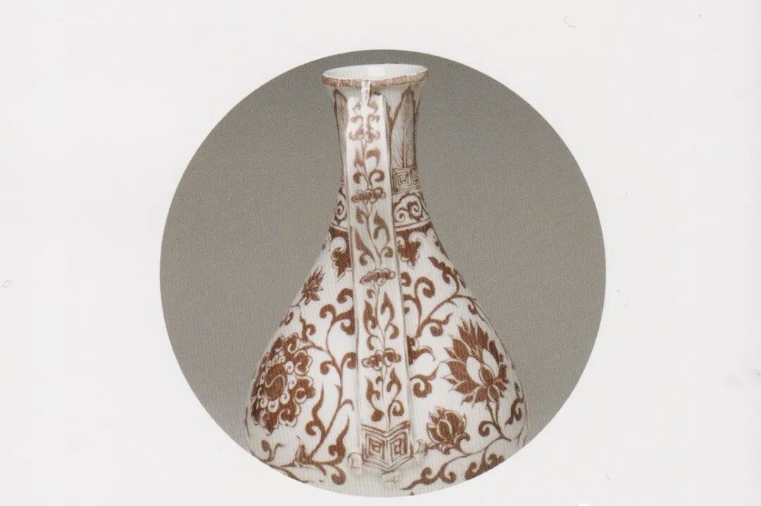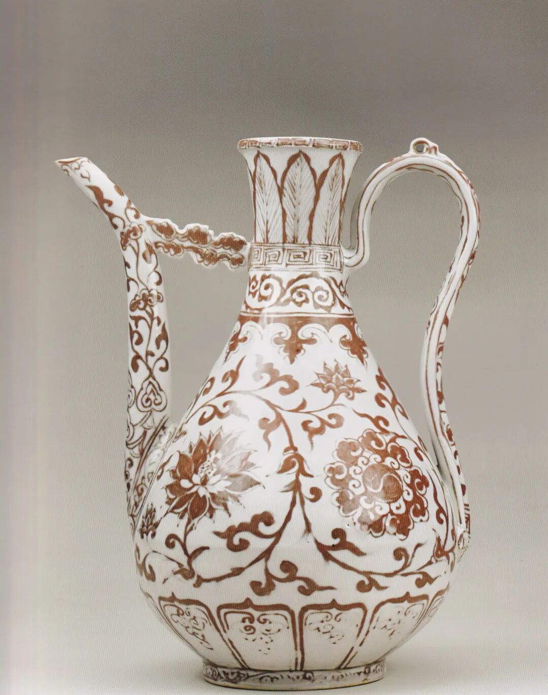 氧化铜是瓷器上釉里红纹饰的高温呈色剂。这是-种化学性质非常不稳定、对窑烧温度极其敏感,并对窑烧技术要求极高的一种金属氧化物,所以高温铜红彩的成功率极低。与之相比,用于掼绘釉下蓝色纹饰,即青花的高温呈色剂氧化钻,则显得要稳定得多。如果窑烧过程顺利,氧化铜便能呈现出鲜艳的红彩,正如这把执壶;否则,稍有误差,就只能烧出各种灰白、猪肝红、灰红,甚至呈黑色的色调。明洪武年间,景德镇窑工们生产的单色红融和融里红作品,数量上远远超过之前的元代作品(279-1366年)。釉里红器在元代仍然属于实验性的制作,明代釉里红瓷器的制作虽然扩大了规模,但实际上传世作品仍然非常稀少。这件执壶原应配有圆拱形壺盖,壹盖顶应有莲蕾式钮以及小环,与壶柄顶上的小圆环相呼应。其他细节如流线型的壶柄上-道中间凸起的棱骨,还有壶柄尾端与壶身粘合处形成的三瓣圆珠纹,则说明这件执壶模仿的原 型应该是金属作品。1994年,考古队在景德镇珠山东门头挖掘出几件青花执壶,形制与本件作品非常相似。