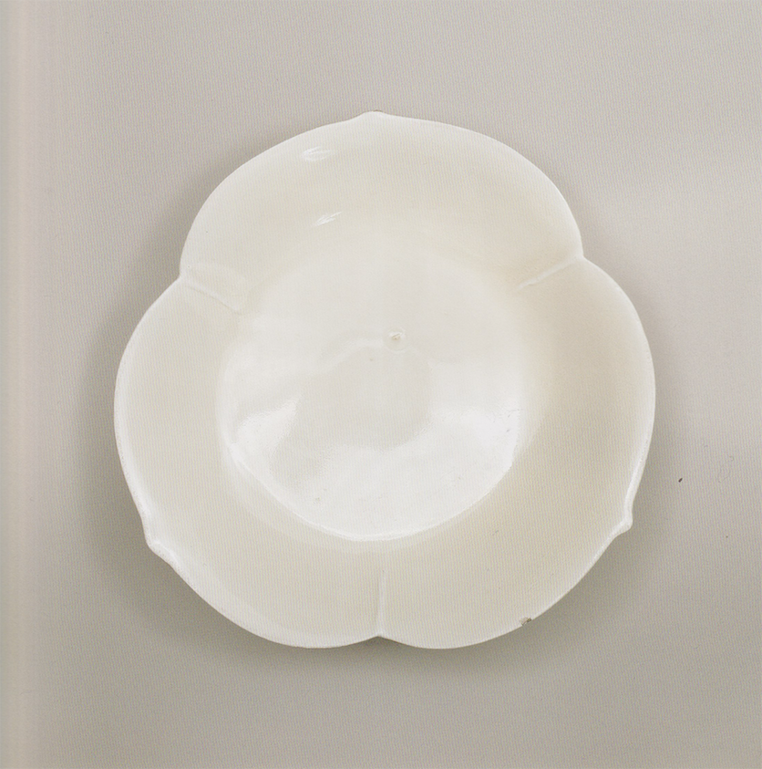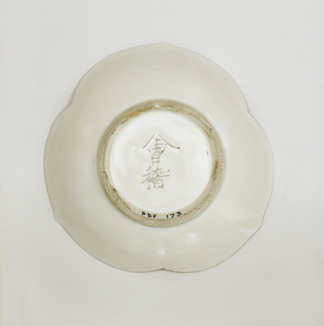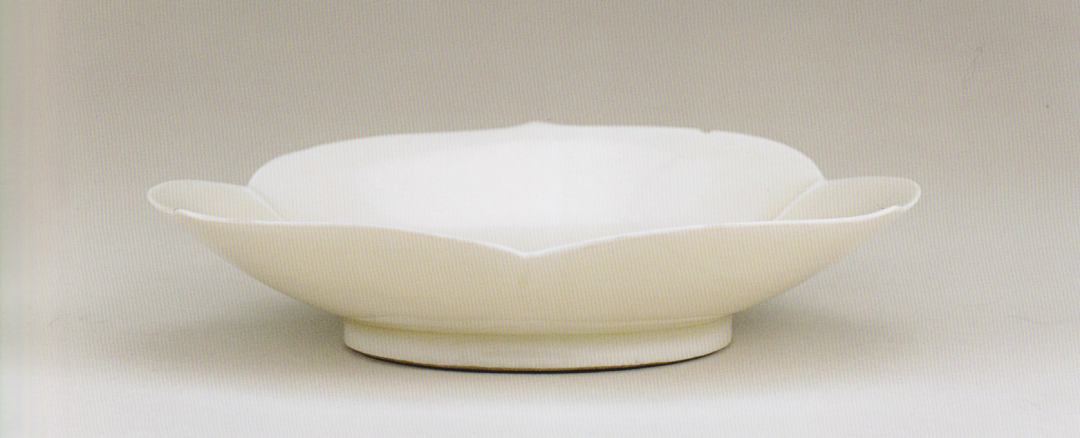 此盘为工匠采用当地灰白色瓷土,在轮盘上拉坯成型,盘沿呈三瓣式。该花瓣式造型也常见于北宋(960 - 1127年)同时期的银器与漆器。陶工们首先在三瓣间添加三道筋线,再通体施透明釉,置于名为匣钵的粗糙容器中烧制而成。匣内垫细砂, 因此圈足露胎处可见垫砂痕迹。有铭文的定窑器物很少,除非是一些高级定窑器上会带有“ 官” 或者“ 新官 ”款。此盘品质堪比“ 官" 款器,外底却刻有“会稽“ 二字。曾任大英博物馆亚洲部主任的霍布森先生(1872 - 1941年)千1934年出版的著作中第一次将此盘公诸于世, 并将铭文解释为“会稽",读作Kuaiji,古指中国南方地名, 今浙江绍兴。然而近年来, 康蕊君对这两个字提出了一种新的阐释, 认为"稽"(为审查之意)是“ 计” (为计算之意)的另外一种写法,“会” 可以读作“ hui ” 或“ kui“,也可以读作“ kuai", 会计是当时“ 会计司”(宫廷财务处)的缩写。故认为此盘应当是为当时的宫廷会计司所制,这种观点使得此盘为官用器的说法变得更顺理成章。该盘上的“会稽“ 二字刻于烧造之前,不可能为后世所加。