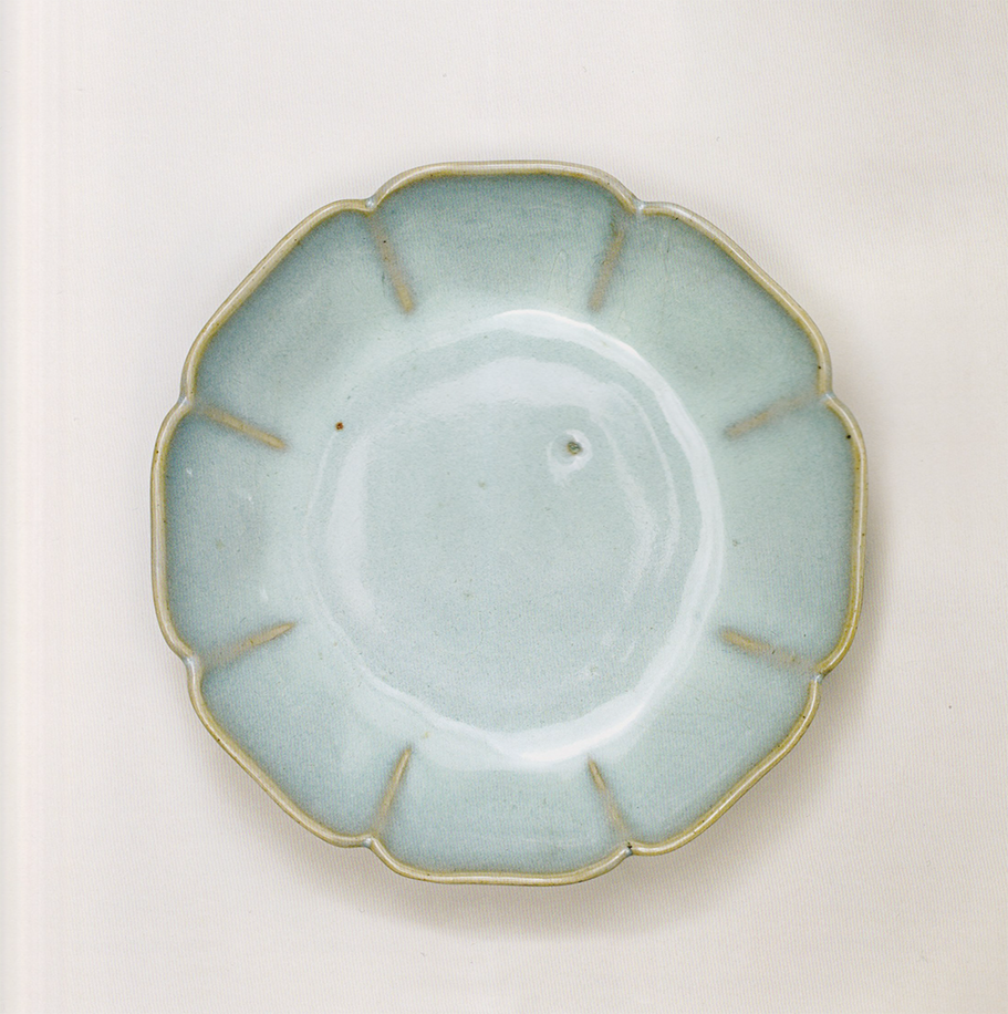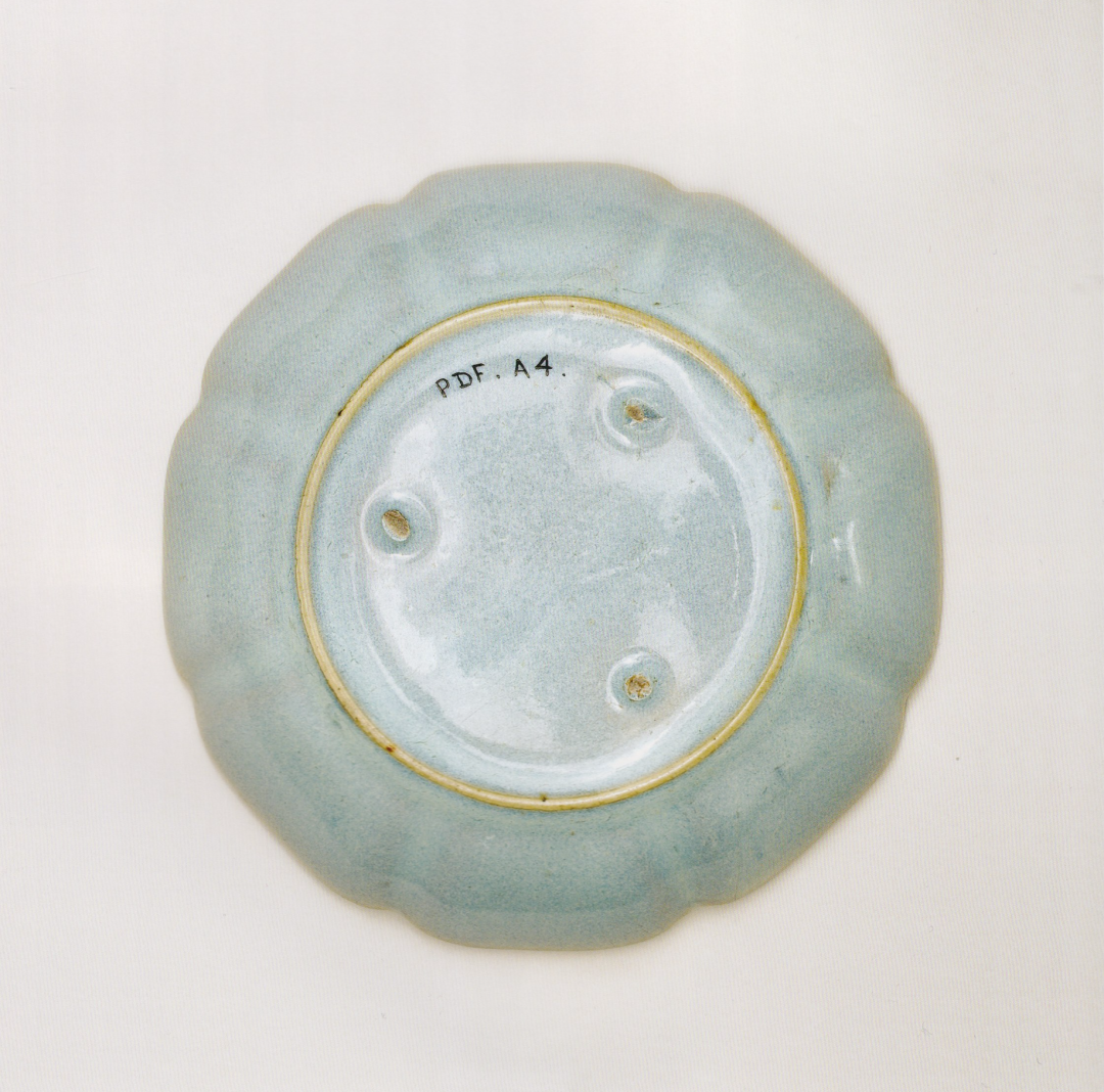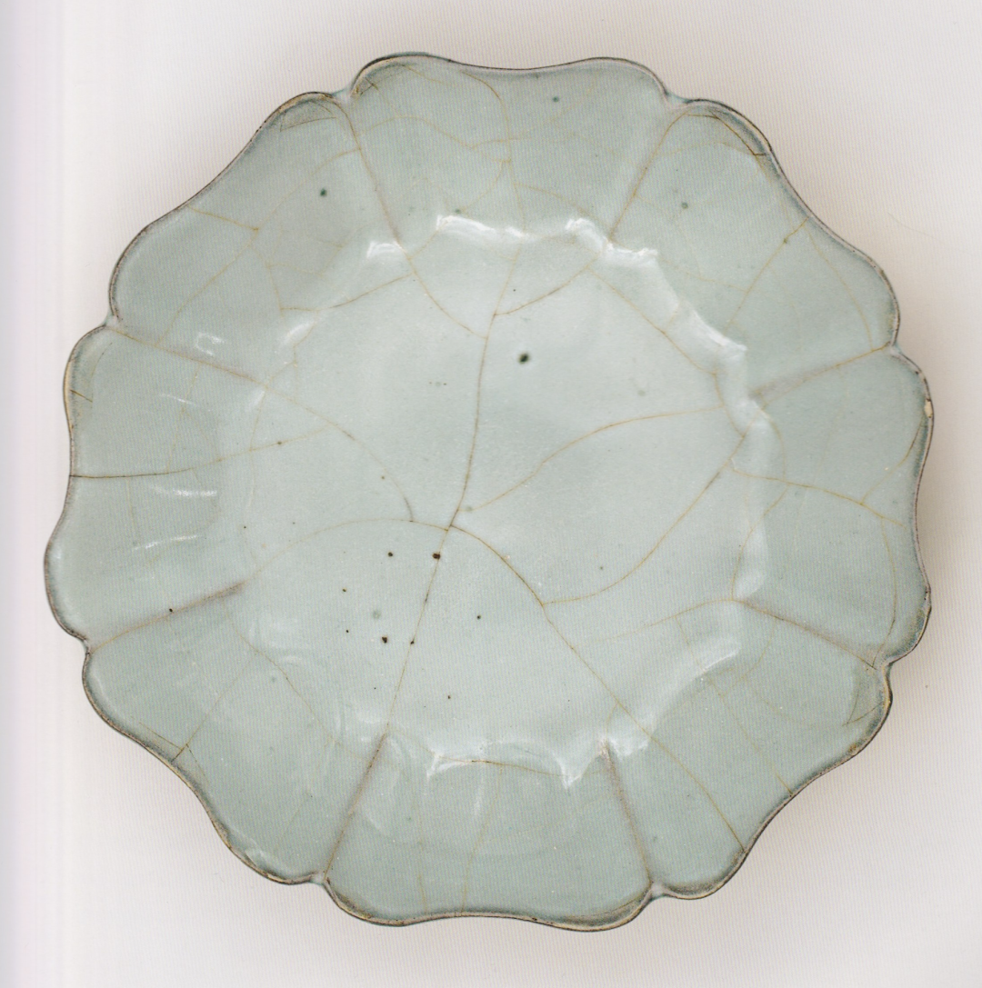 此宋王朝在12世纪被金人打败,失去了对中国北方地 区的统治。1127年, 其从汴京(今开封)迁都到长江边上的临安(今杭州),并建立了新的政权,史称南宋。宋高宗统 治时期(127- 162年),为恢复生产北宋帝王们钟爱的汝窑器,建立了官窑。官窑胎体较薄,瓷土呈深灰色,施釉较厚且光滑,釉中气泡密集,釉面大开片,片纹较宽处可见赭褐色胎体。此盘尽管与钧窑八瓣式盘颇为相似(参见图版10),但更为精致,其八瓣葵口每瓣都精心刻划压印,以追求锦葵花朵的自然形态。四川彭州南宋窖藏金银器中发现有类似造型的银器。尤其有趣而罕见的是,盘底釉面有指纹印记,疑为当时施釉的陶工所留。