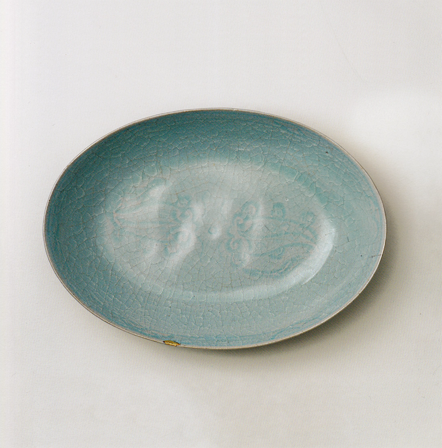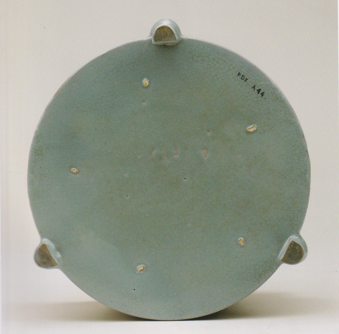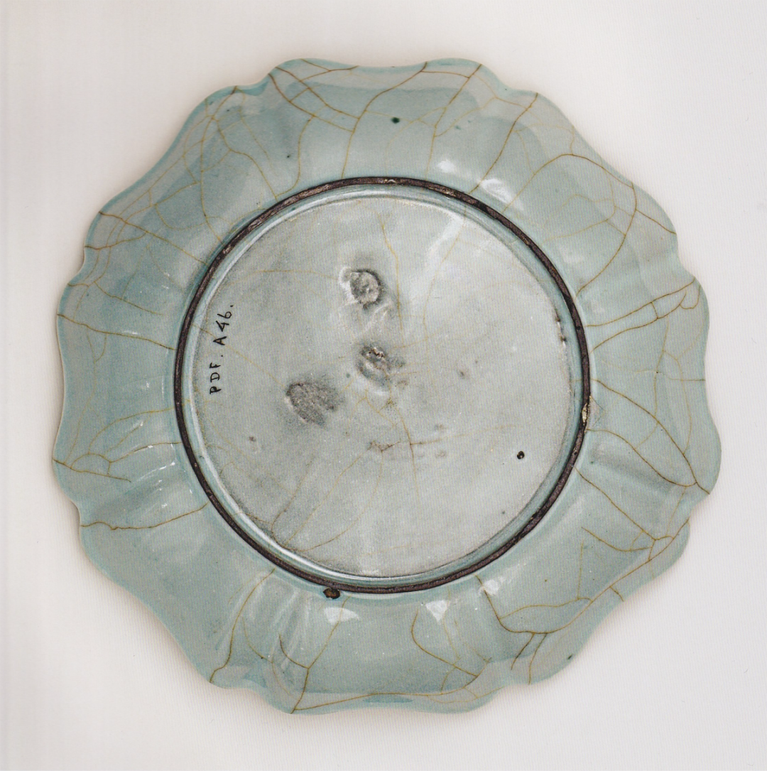 此宋王朝在12世纪被金人打败,失去了对中国北方地 区的统治。1127年, 其从汴京(今开封)迁都到长江边上的临安(今杭州),并建立了新的政权,史称南宋。宋高宗统 治时期(127- 162年),为恢复生产北宋帝王们钟爱的汝窑器,建立了官窑。官窑胎体较薄,瓷土呈深灰色,施釉较厚且光滑,釉中气泡密集,釉面大开片,片纹较宽处可见赭褐色胎体。此盘尽管与钧窑八瓣式盘颇为相似(参见图版10),但更为精致,其八瓣葵口每瓣都精心刻划压印,以追求锦葵花朵的自然形态。四川彭州南宋窖藏金银器中发现有类似造型的银器。尤其有趣而罕见的是,盘底釉面有指纹印记,疑为当时施釉的陶工所留。