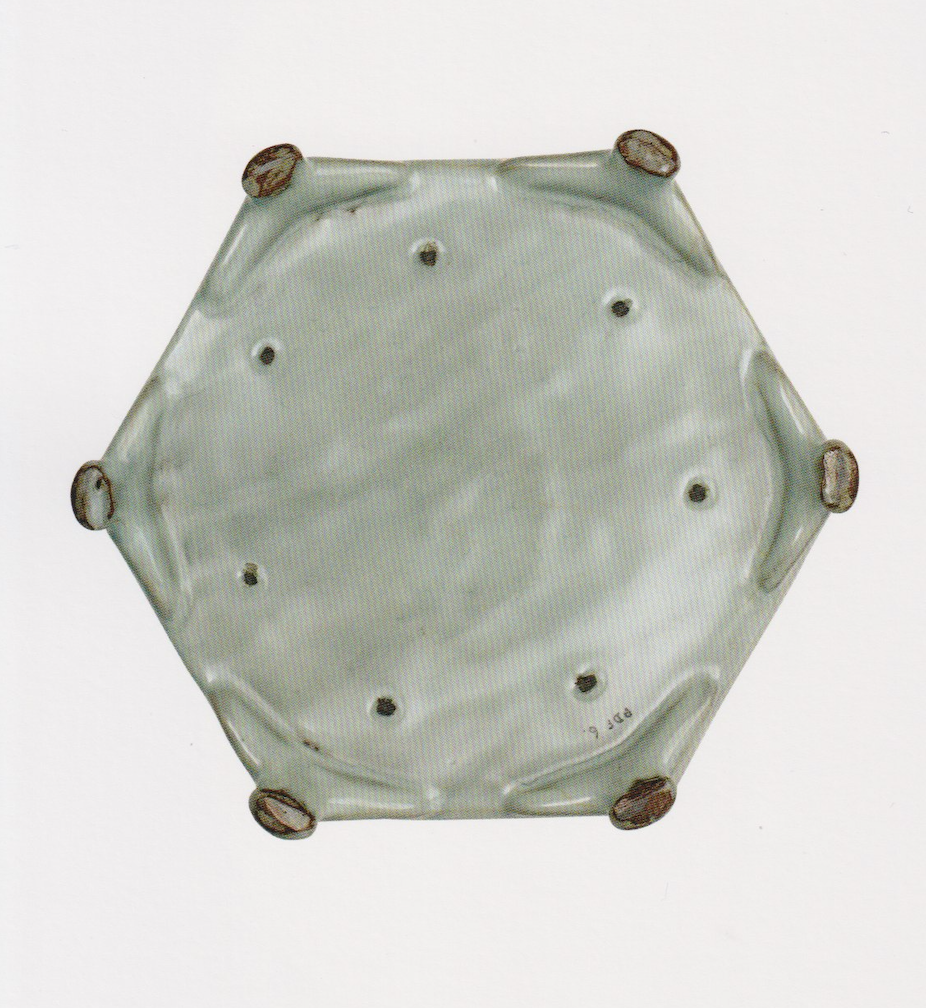 官窑瓷器通常被描述为“紫口铁足”,指其口沿釉薄处胎体呈深灰紫色,足底无釉露胎处呈铁褐色。此深腹的青釉六棱六足洗造型在这一时期的存世品中极为罕见。其平直的口沿及折腹造型显然并非瓷器所固有,可能是南宋官廷仿自金属器皿。此器用途不明,可能是在官中用作某种官窑六棱花盆的盆托,花盆内填土以裁种植物,花徐庞部应当开有排水孔。另外此六足洗也有可能不与花盆配套,而是直接用来栽植水仙等球茎类植物。