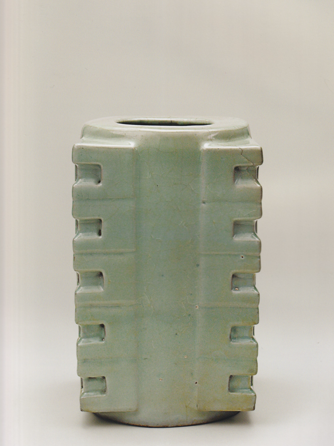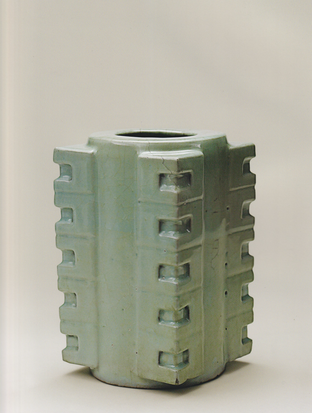 玉琮是一种内圆外方的简形器,流行于约公元前3000 ~2000年中国江南地区(今江苏省和浙江省)的良渚文化。玉琮被当作祭祀礼器与人同葬,不仅是权势和财富的象征,同时玉也被认为可以保持尸体不朽。宋代时,文人热衷于古物和金石学,关于青铜与玉器的著述颇丰。这一时期的工匠们也将这些古物的造型应用于不同材质的器物上,以满足当时富裕阶层的需求及社会盛行博古之风的需要。考古学家在一些南宋窖 藏中都发掘出用不同材料制作的仿古琮式器,如在四川彭州窖藏出土的琮式青铜器,和四川遂宁金鱼村窖藏中发掘出的石刻以及青釉琮式瓶。