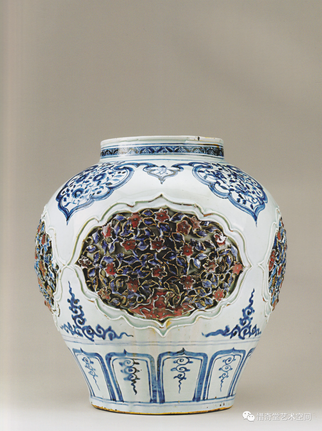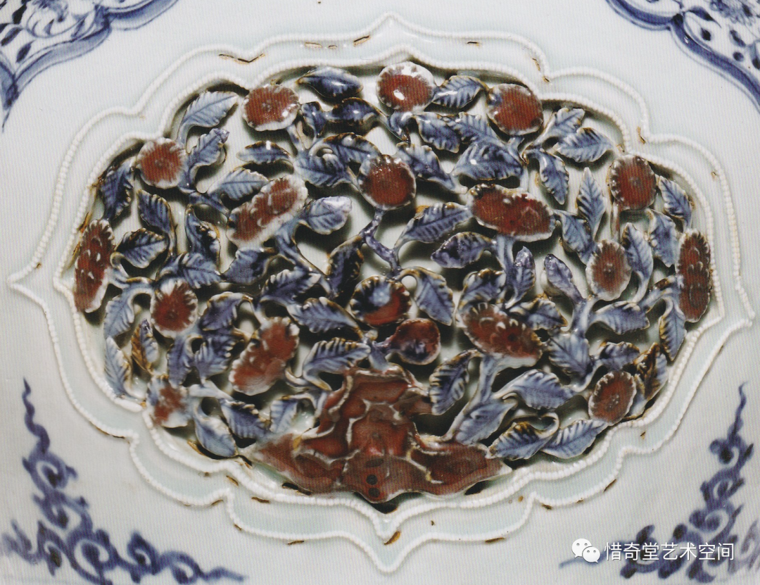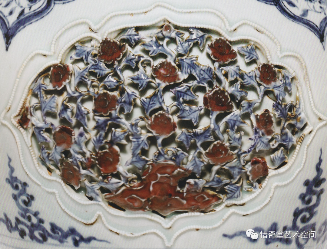 这件瓷罐制作于14世纪前半叶,展现了当时最新的烧造技术,即将釉下高温铜红、钴蓝与镂空贴花工艺共冶一炉,使用在同一件罐子上。罐身呈椭圆形,直短颈,底足无釉。窑工在肩部的四个如意云肩纹内分别画四季花 卉春牡丹、 夏荷花、秋菊花、冬梅花;在罐足胫上绘 一圈仰莲瓣纹。罐腹上为四个四瓣式开光,每个开光里用贴塑手法装饰洞石花草纹,花朵施高温铜红彩,花叶和岩石则是钴蓝彩,再以篦划纹强调叶脉等细节。开光的双边框先以沥粉法用细泥浆描出轮廓线,再切划泥线细部形成 联珠纹样,是元代瓷器的特征之一。高温还原焰的窑烧氛围使罐子的白釉略闪青蓝,不均匀的施釉手法也使罐身釉面出现厚薄不均的条纹。