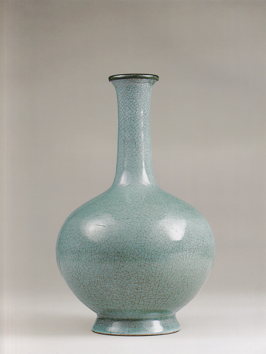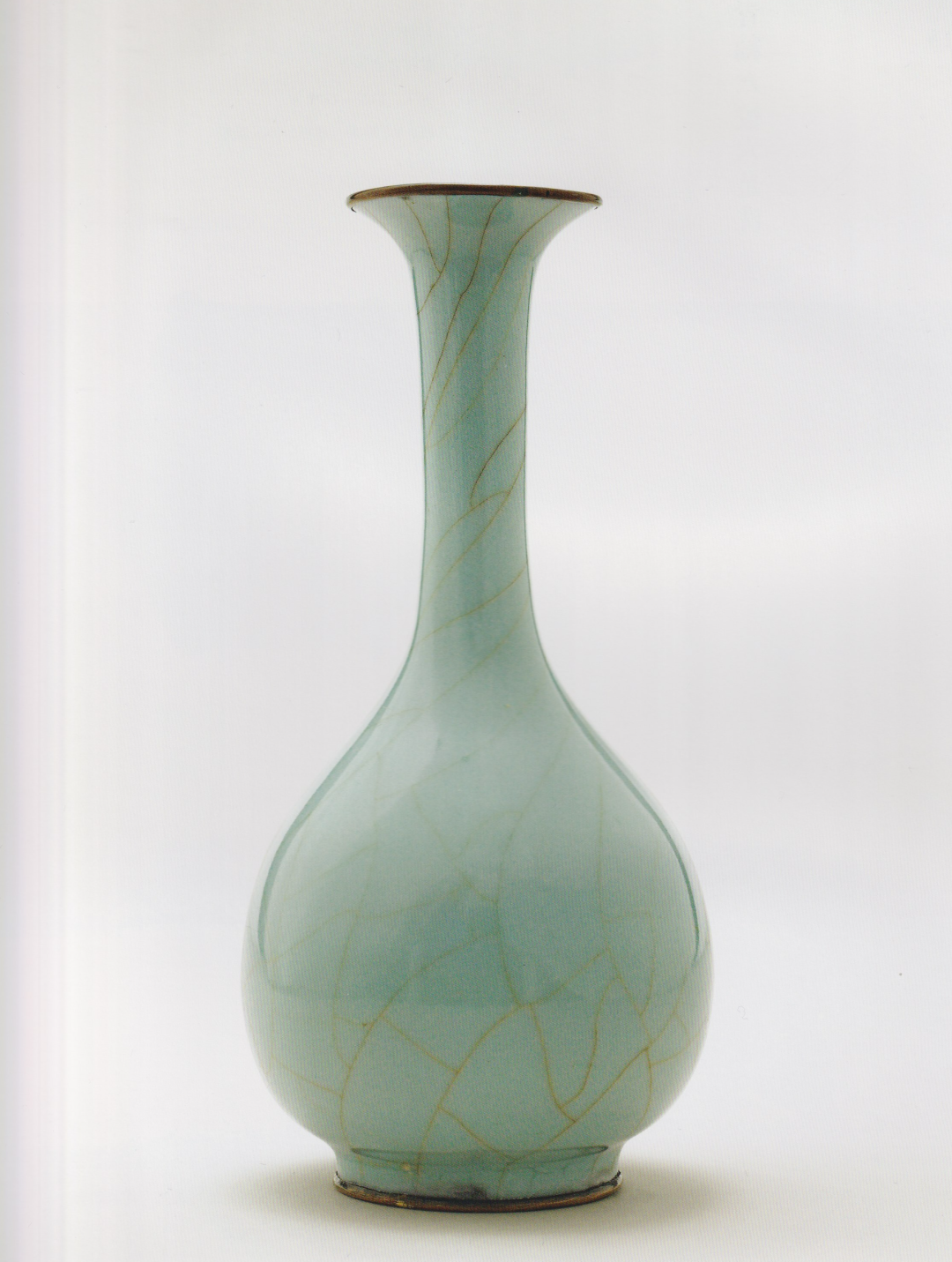 元素使釉面偏黄,因而青釉呈色显得愈发青莹。当时中国北方大部分窑场都采用煤作为燃料,故很多青釉面呈现发黄的现象,而汝窑却采用木材作为燃料。考古学家在清凉寺窑址发掘出土了类似的长颈侈口斜圈足天青釉瓶,此物也许因为口沿稍有瑕疵或者破损,以铜片包边作为修饰。