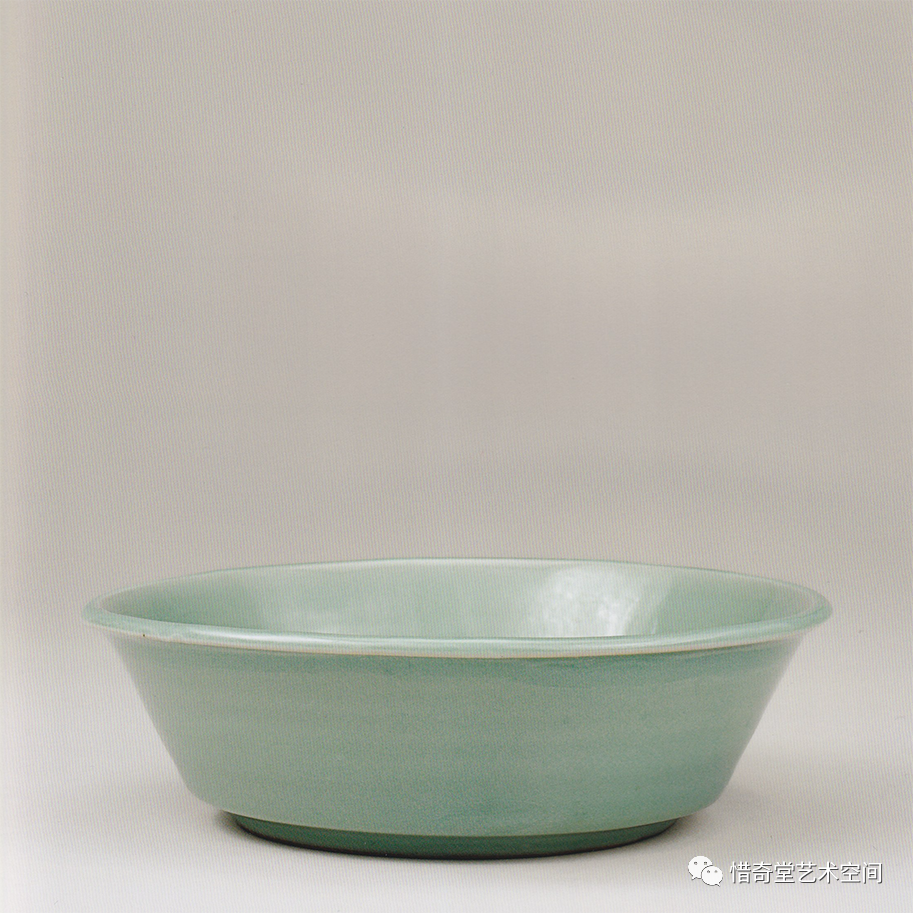 1991年在四川遂宁金鱼村南宋窖藏中发掘出土有类似的青釉笔洗,但尺寸都比这件小。此洗卷唇,折腹,矮圈足,通体施青釉,器外壁及内底呈豆青色。最精美的青瓷中有一些来自南宋龙泉窑。龙泉窑瓷胎呈浅灰色,烧造后经氧化露胎处呈桔红色,正如本件藏品的圈足处。龙泉窑虽然并非官窑,其产品仍曾供给宫廷日用,另外也供一般中产阶级及外销使用。龙泉窑之胎釉原料均就地取材,因此其制瓷技术虽深受官窑影响,其最终产品却有很大不同。
