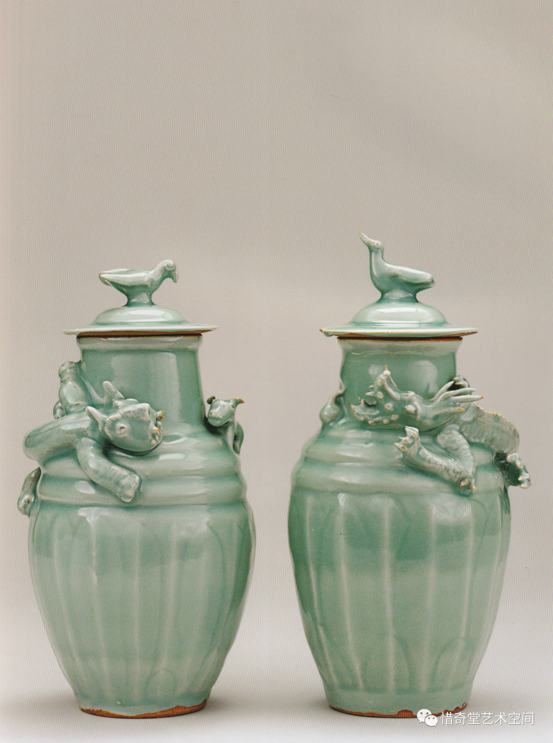 此对随葬用瓶肩部贴塑有两只“四方神兽”。左边一件肩部贴塑象征西方的白虎正在追逐一犬, 右边一件的贴塑则是象征东方的青龙在追赶火珠,盖顶的鸟钮则象征着南方朱雀,唯独不见象征北方的玄武。早在汉代时期(公元前206-公元220年),工匠们已开始用这些神兽装饰棺椁和墓室。此对瓶腹部皆装饰浅刻莲瓣纹。在浙江龙泉大窑窑址与龙泉周边南宋时期墓葬里均发现有类似的青釉瓶,证明这种器型是南方当地墓葬习俗的一部分,可能是用来盛放在冥界的给养譬如谷物。这种器型从未外销也并未进贡给宫廷。因此这对堆塑青釉瓶应不是传世品,而是墓葬出土物,这在大维德爵士的藏品中显得尤为特别。