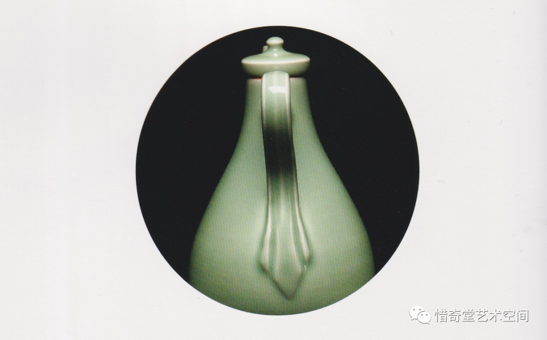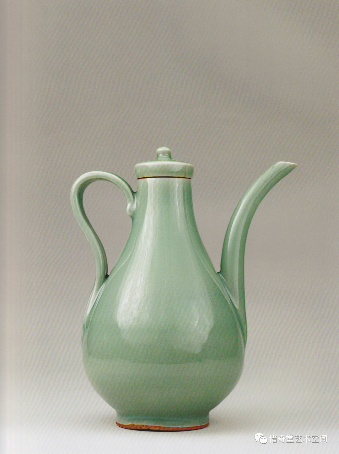 此青釉执壶引人入胜,为此类存世物中罕见之珍品。此壶呈梨形,一侧为曲状长流,另一侧为曲状起棱带形把,拱形钮,可能仿自青器或银器造型。此壶细部处理精美,譬如壶柄底部的处理,分成紧密结合的三段,十分协调。元以后的明朝第一一位帝王洪武时期(1368 ~ 1398年),有龙泉执壶沿用梨形壶造型,但带有刻花纹饰,且流与壶身间常有卷形饰件相连。据霍布森先生记载,这件执壶是 大维德爵士从日本神户的“广 冈”收藏Hiroo Collection)购得。青釉器物,中文称青瓷,英文称"celadons" ,日文称 为“青磁”(seiji), 在日本备受推崇,视若珍宝,被当作古董收藏,有些器型则适用于茶道。