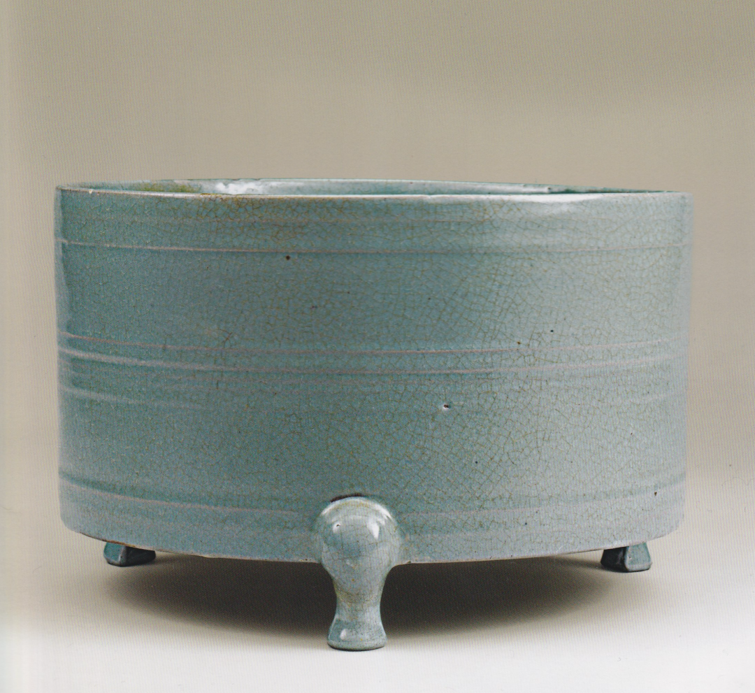 此炉形体硕大,造型和釉色都散发出古雅的风格。陶工们将此奁器塑造为身呈简形、刻弦纹、三弯足,样式仿制战国或汉代(公元前475 ~公元220年)的青铜或漆器奁(lian)的造型。釉面开片,釉色蓝中带灰绿色,给人以深沉凝厚的 古玉美感。1151年, 南宋宠臣张俊献给宋高宗(1127~1162年在位)的礼物中有16件汝窑青瓷,其中就有一大一小两件香炉,其中之一可能与此件相似。考古学家发现,自宋代都城从开封南迁至杭州后,在杭州老虎洞的官窑继续为官廷生产类似的香炉。