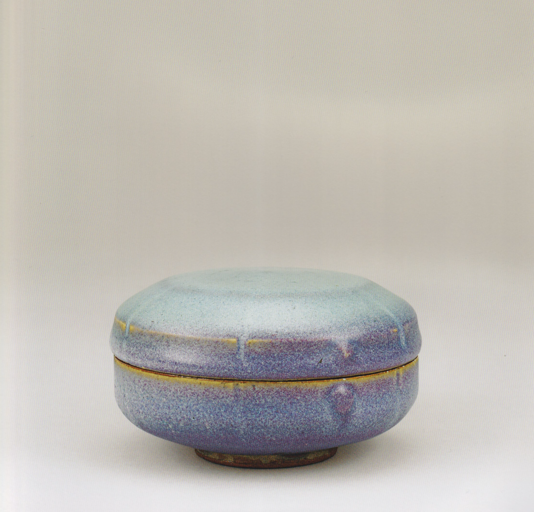 此盒呈圆形,盖面平担,盖沿为六滩形,此器型也常见于北宋同期的银器造型。盒盖与盒身子母口处各有圆形凸起,以便使用时扣合准确。盒盖顶部及内部釉面呈天蓝色,盒身以及子母口处釉色呈玫瑰紫色,盖盒接口及底足釉薄处,呈半透明橄榄绿色。与同时期的北宋青釉器如汝窑和耀州窑相比,钧窑胎体相对粗糙。钧窑以天蓝色的乳浊釉、玫瑰紫釉以及偶尔出现的青釉著称。尽管有学者认为一些质量上乘的钧窑器物曾被进贡到北宋宫廷,但是大部分钧窑器仍属于民窑产品,且很少被出口到国外。此类器型小巧的盖盒般被用来存放胭脂、印泥或者香料。在当时钧州(今河南禹州或禹县)地区,许多窑口都生产施此类釉的钧窑产品。