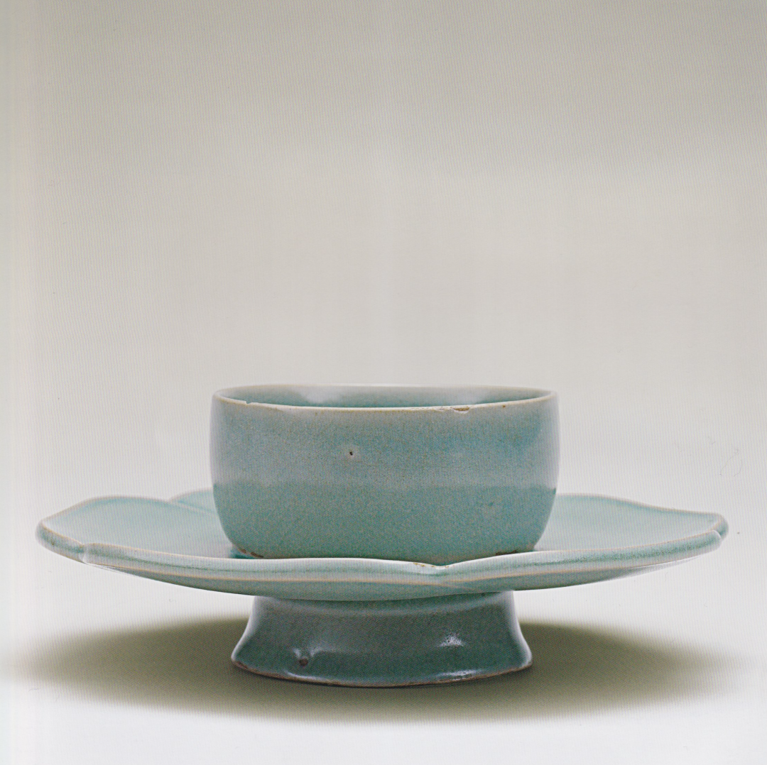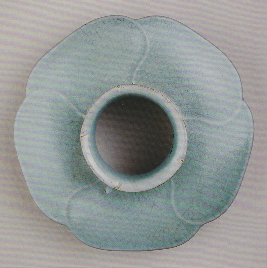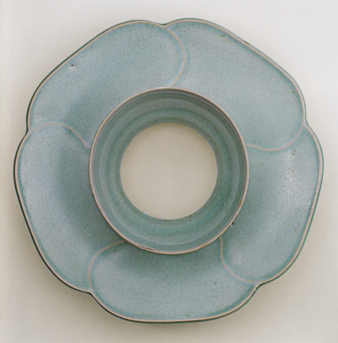 此汝窑盏托托口形似小碗,托盘为展开的五曲花瓣形,下接喇叭形圈足。采用满釉裹足支烧法,圈足留有五个椭圆形支钉痕(译者注:因状如芝麻,俗称“芝麻钉”)。该样式的盏托也常见于宋代同时期的漆器及金银器,其设计灵感可能来源于五瓣锦葵。盏托花瓣重叠,五曲带筋,施青釉,釉面有细小开片。河南宝丰县清凉寺曾出土类似的盏托,也应为此作品的产地。北宋宫延成员多使用此类盏托作为托具,承接不同材质的碗供饮茶之用。12世纪的高丽陶工们为高丽宫廷提供的青瓷也有仿制此类汝窑的高水平作品,且青釉的化学成分与之相似,显示早在北宋时期国际上就有关于陶瓷技术的交流。