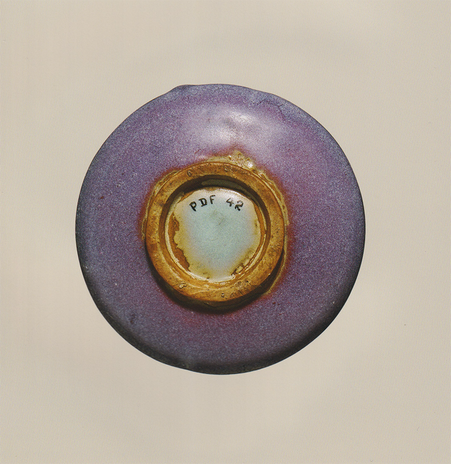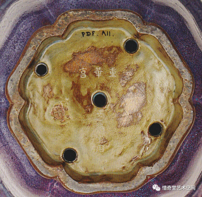 如果这件花盐底所镌刻的铭文可靠,它应该为乾隆时期(736~1795年)紫禁城内“重华宫”中的“芝兰室用”,是室内的陈设用器。重华宫属于乾隆皇帝内廷居所的一部分。花盆外部釉为光滑明亮的丁香紫色,盆里呈天蓝色,盆底刻有“五”字,说明它属于钧窑器中一组特殊的带编号数字的产品。这组钧窑器物均刻有从“一”至“十”的数字,一”号器物尺寸最大,十号最小。这件花盆底有五个小排水孔,原应与一个六瓣折沿盆托配成套。与早期的宋、金、元时期的钧窑器不同,这种带数字编号的器物未曾在墓葬中出土过,只出现于宫廷藏品中,故推断其应该是专供宫中使用而制的。