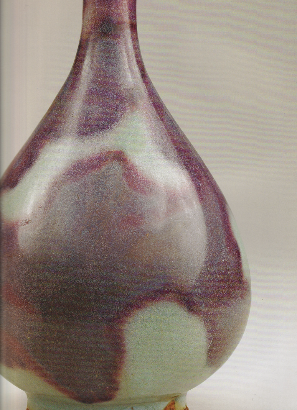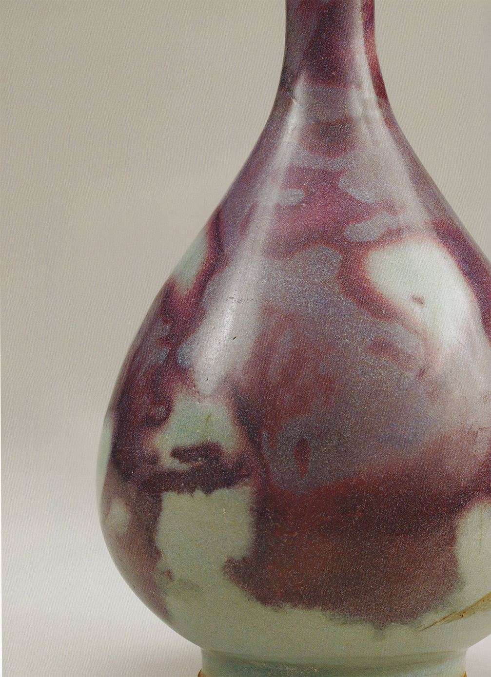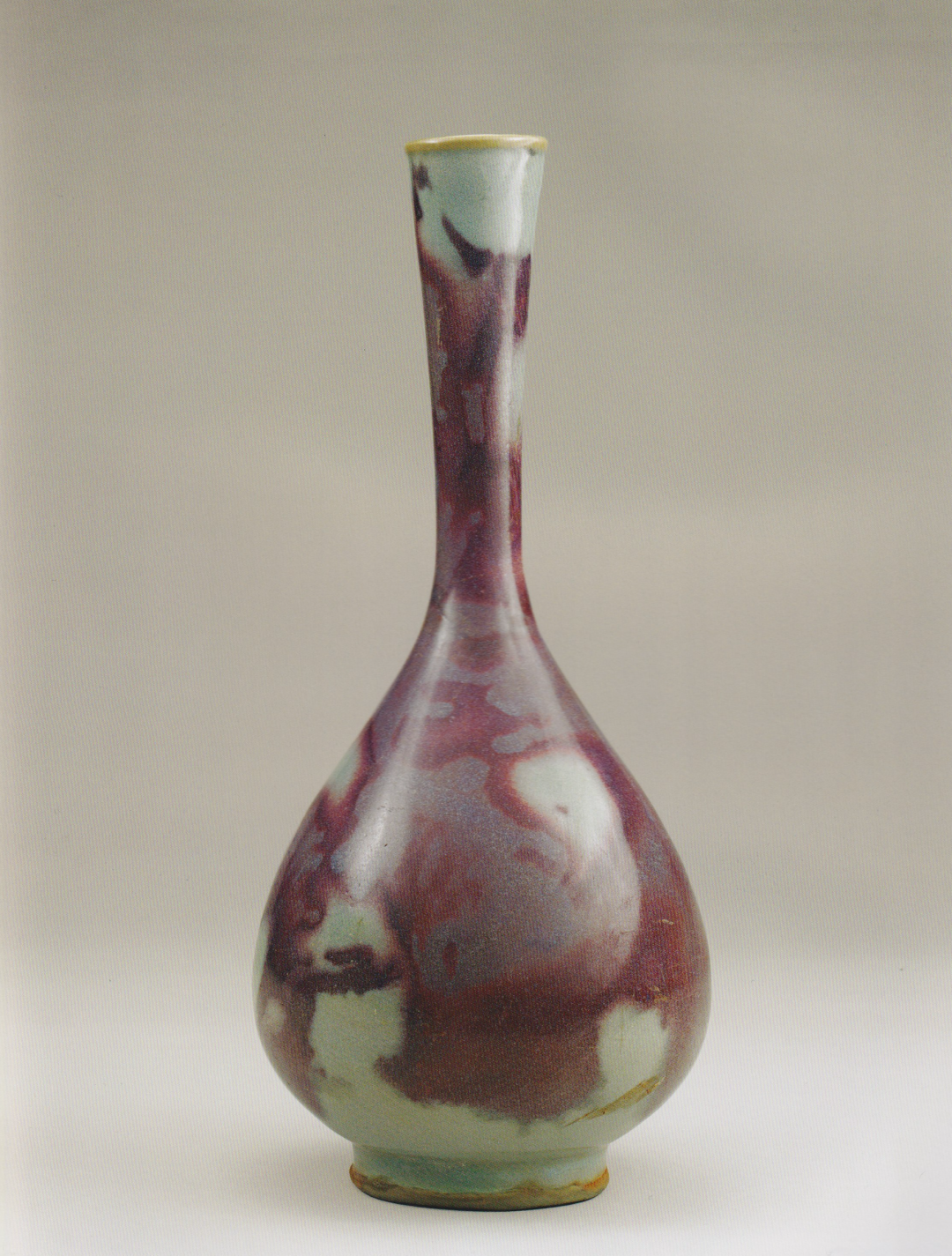 北宋窑工的制瓷技术极其高超,正如此瓶造型技术难度之高所示,先通过分段拉坯然后接坯而成,其瓶腹呈圆润的梨形,颈部纤细修长,口略侈。窑工们入窑前在干涩的釉面酒以富含铜的釉料,以取得自然晕散的紫斑效果。钧窑在施釉上不如汝窑和官窑讲究,此瓶底部圈足内施釉,胆瓶内壁施釉仅至颈部,其下未施釉。北宋墓葬壁画显示此类瓶在当时有的被用作花器插单枝花,但另外也可 能曾用作酒器。一千年以后 的英国著名现代陶艺家伯纳德 利奇(Bernard Leach, 1887 ~ 1979年)等人受钧窑变幻无穷的乳浊釉启发,创造了独具自身特色的窑变釉艺术。