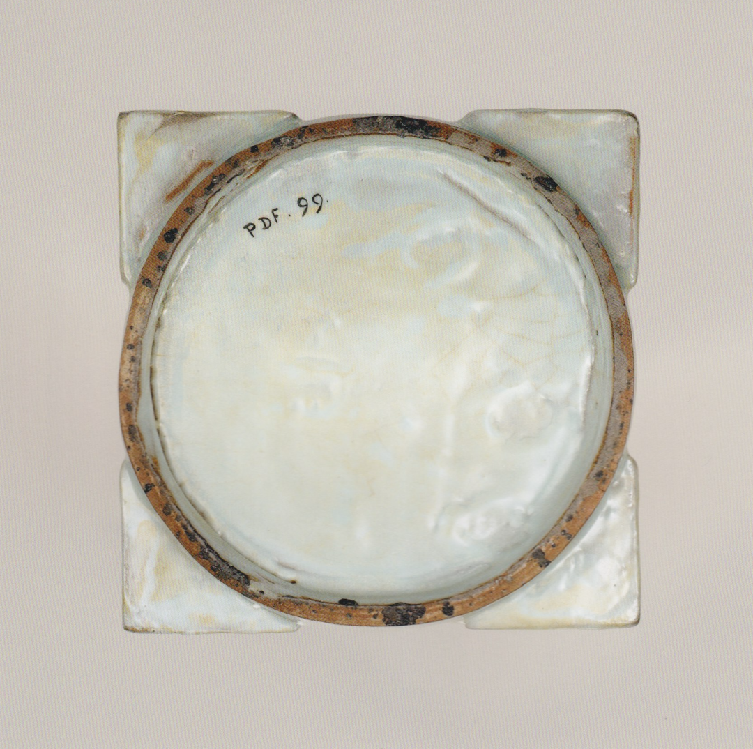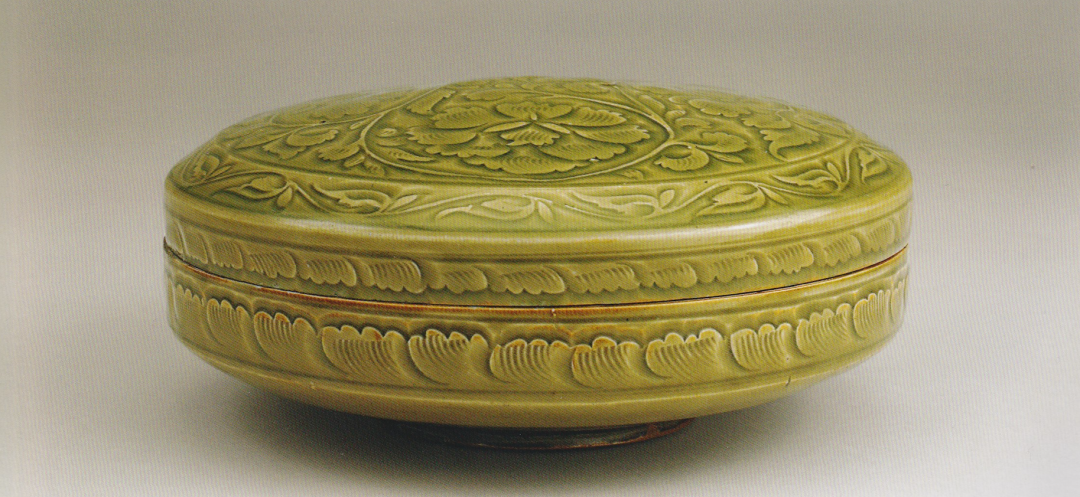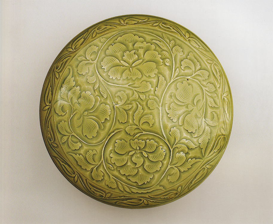 此盖盒胎体呈浅灰色,胎质细密,釉面均匀.呈橄榄绿色。工匠在半干的胎体上用深刻花进行装饰.盒盖中心深刻四朵缠枝牡丹纹,环绕一圈卷草纹,子母口处上下刻仰覆花瓣纹。在刻花之后用梳形工具于细部进行篦划装饰,而后施釉,青釉随着刻花线条的凹凸起伏,在烧造之后釉质呈现出深浅有致的美感。耀州窑以煤作为燃料在匣钵内烧成,其产品质量上乘者或被地方官员进贡到北宋宫廷、与此同时耀州窑也被商入行销至各地。考古发掘表明,在亚洲、中东和东非的许多中世纪遗址中均有质量稍逊的耀州窑瓷器出土。在宋代,质量最好的耀州窑中心窑场位于今天铜川市附近的黄堡镇,此地因古属耀州而得名。