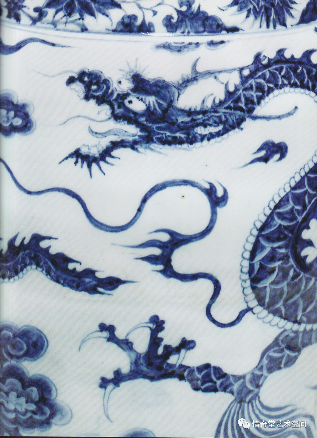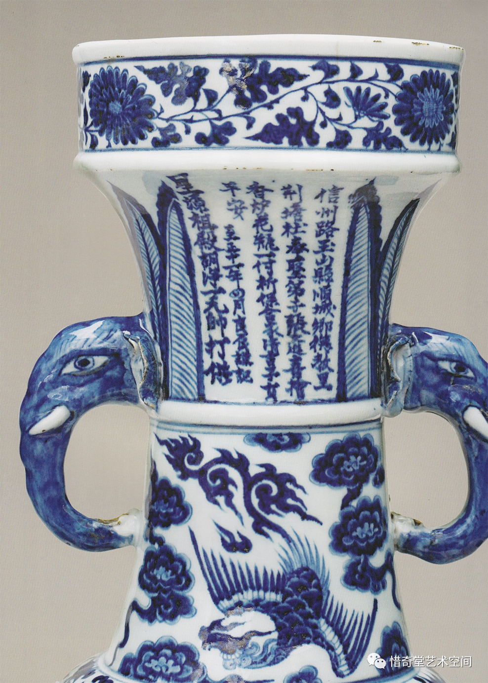 这对造型源自铜器的釉下青花象耳大瓶,不仅是大维德爵士珍藏中最著名的藏品,也是举世闻名的陶瓷杰作,-.直被学者们和鉴赏家们昵称为“大维德瓶”。这对瓶子具有非比寻常重要性的原因,是瓶颈的一-面上写有一段带 明确纪年的祭祀铭文:“信 州路玉山县顺城乡德教里荆塘社奉圣弟子张文进喜舍香炉花瓶一付,祈保合家清吉子女平安。至正十一年四月良辰谨记。星源祖殿胡净一元帅打供。”这是迄 今所知最早的带纪年款的元青花作品,别无它例。铭文记载了玉山县的信士张文进,为了祈求家人的平安,向星源(今婺源县)的一座道观, 敬献了这对花瓶和 一件香炉 (香炉至今下落不明),落款为元至正十一年(即1351年)。玉山县在江西省东北部,位于大瓶产地景德镇东南120公里处。这段铭文是研究青花瓷器发展史的唯一文献性证据,说明景德镇的青花瓷器制作在1351年已经相当成熟。瓶颈两侧的象首耳里原应带铺首环。与西方观念不同,龙在中国的传统文化中象征吉祥,它们最初掌管着天降甘霖雨露,而最终成为了皇权的象征。