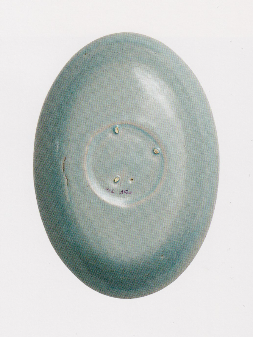 当时河南工匠在制作这类胎体轻盈的洗的技术上具备领先地位。此洗通体施釉,采用裹足支烧,外底圆形的凹进处仅留有三个芝麻钉露胎痕迹。此洗内底釉下刻两条游鱼,象征着富贵有余。许多鉴赏家都持有“汝窑为魁”的观点,汝窑器物的釉色精美,蓝中带灰绿,且密布细碎开片。汝窑为宫廷烧制瓷器的时间很短,约从1086年 (哲宗元祐元年)至1106年(徽宗崇宁五年)或1125年(徽宗宣和七年),窑址以外的存世品极少。此洗呈椭圆形且刻有游鱼纹饰,使其极为罕见。河南宝丰清凉寺发现有类似的汝窑碎片,证明该地就是此汝窑洗的烧造地。
