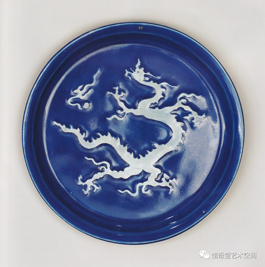 此件非同寻常的盘子使用了一种极其罕见的蓝地白花工艺。工匠首先在除底部外的整个盘子通体施钴蓝釉,然后用薄泥片切出健龙戏珠纹并粘贴到盘心,再用白浆描画龙的细节如三趾龙爪等,仔细刻划出龙鳞;再用蓝彩点出龙睛,以增强生动感。最后,工匠将盘子通体再罩上一层透明釉,放入1280°C ~ 1320C的高温窑炉中烧造而成。龙身上可能原有描金,其平底浅折沿的造型也应源于一-种金属器物。