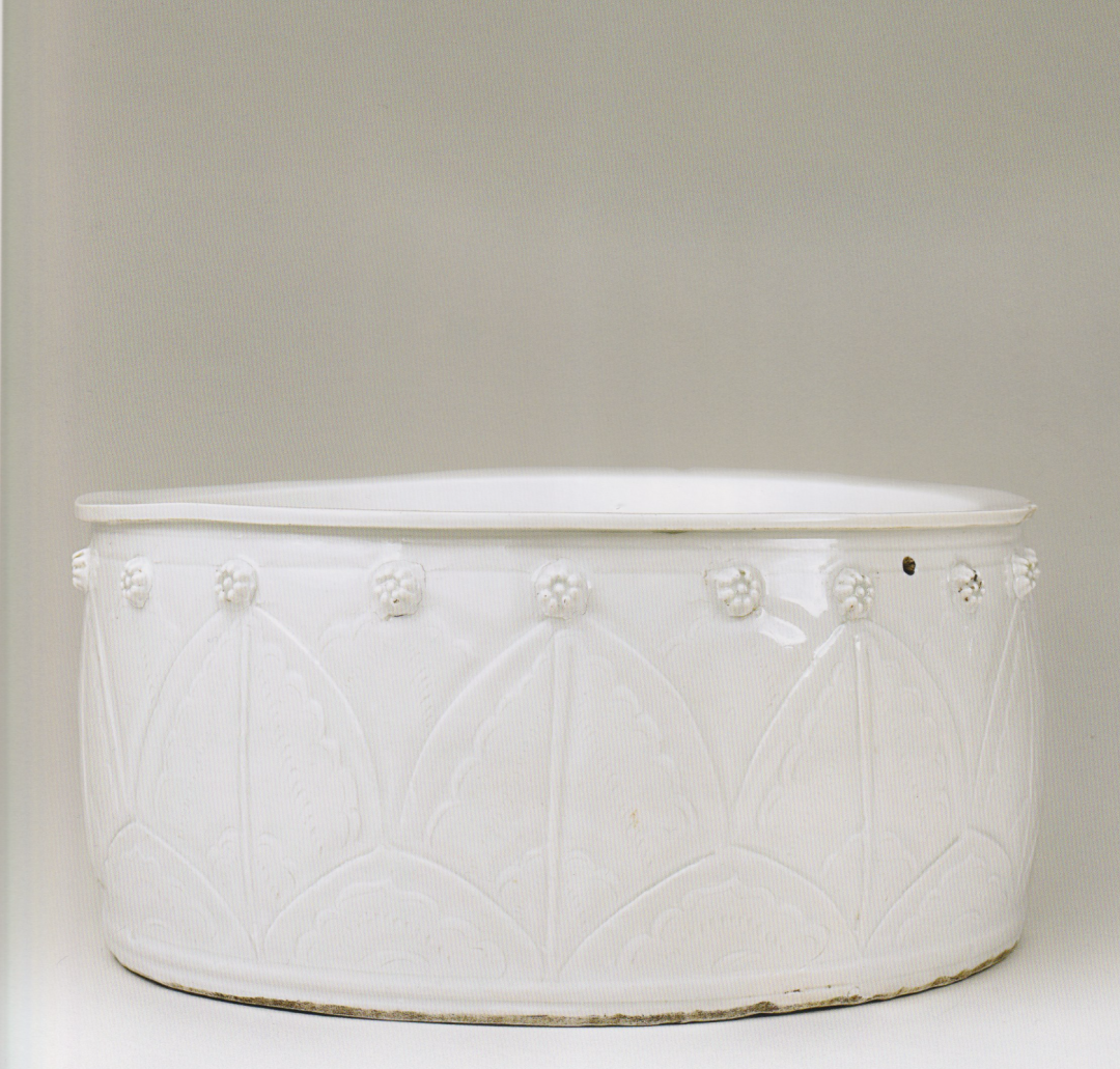这件钵外壁所刻两重仰莲瓣纹,是佛教中常见的象征性主题,鼓式造型可能暗指寺庙中用于传唤僧侣信众的庙 鼓,口沿下凸起的一匝精致的小团花则可能是模仿了实物庙鼓皮革上用于固定的柳钉。这个中空如碗型的钵,应该曾被佛教徒们作为钵盂,或者放置在供台上用于供奉净水。在中国的各种古代文献、论著和诗词作品中,都能找“到古人对于邢窑器物的赞美。被尊为 茶圣” 的唐代名士陆羽(733 - 804年),在其约760 - 780年间撰写的世界上第一部关千茶叶的专著《茶经》中,即以如银似雪来比喻邢窑器的素雅之美。邢窑器与定窑器有时较难区分,但透明的釉水之下,邢窑器一般会比定呈现出更偏青蓝的冷色调。