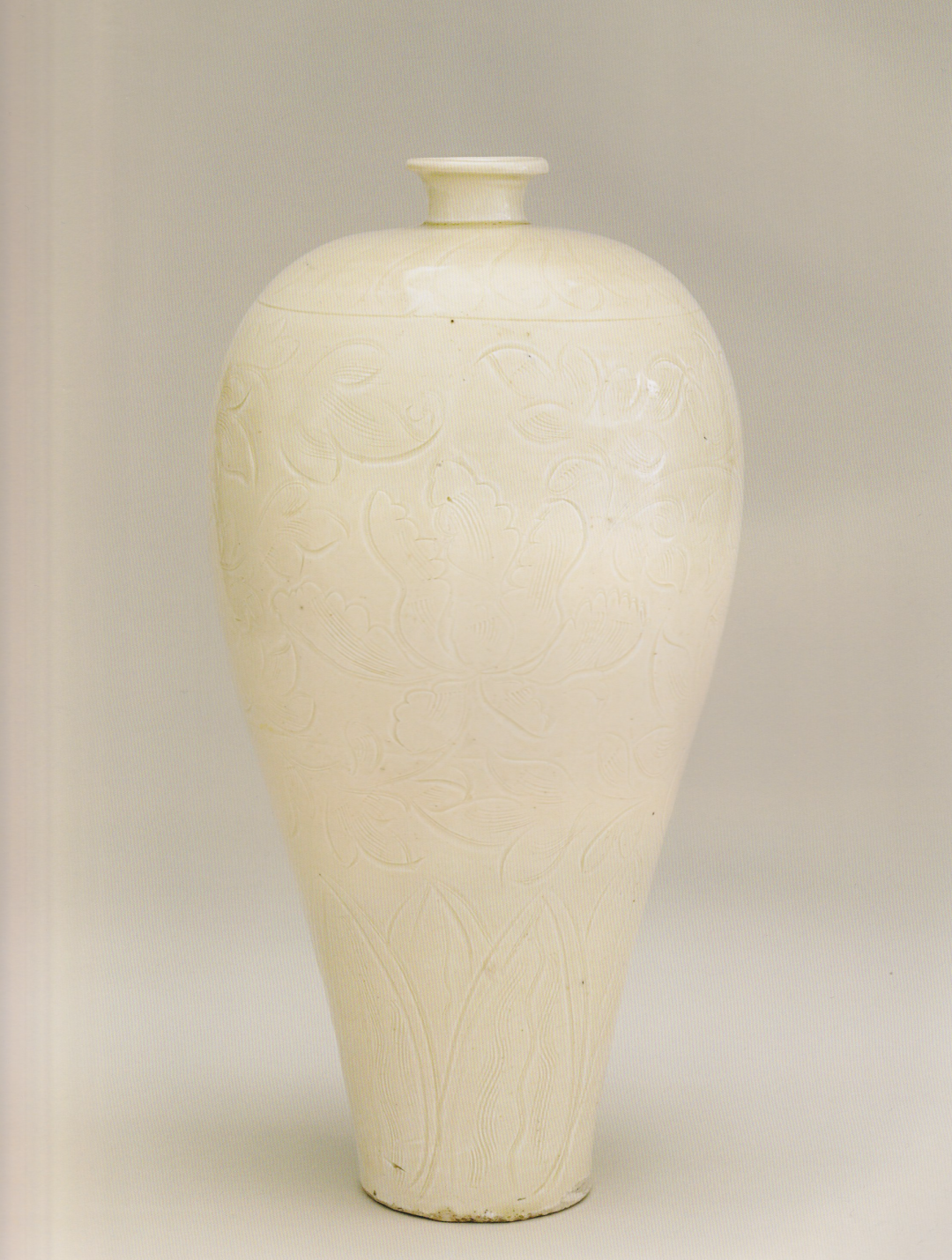 此瓶造型极为优雅。通体施象牙白釉,釉面自然垂流形成“泪痕”般的装饰效果,与篦划及划花纹饰相得益 彰。此梅瓶肩部刻反“s" 形纹饰,腹部刻牡丹纹,足部刻上仰重叠莲瓣纹。北宋时期定窑采用馒头窑烧造,其温 度高达1280C - 1320C。由于用煤作为燃料,煤所含的硫确在氧化气镇下使定密瓷器呈现出一种象牙白的色调。商品质的定窑器是被当作贡品来进献给北宋宫廷的。寺院地宫、皇室宫殿以及贵族墓葬等遗址中均发现过高品质的定窑器,说明即使远在其生产时代定窑产品就已经是备受 尊崇之物了。早在唐代(618 ~ 907年), 曲阳县已归定州管辖,故称为定窑。