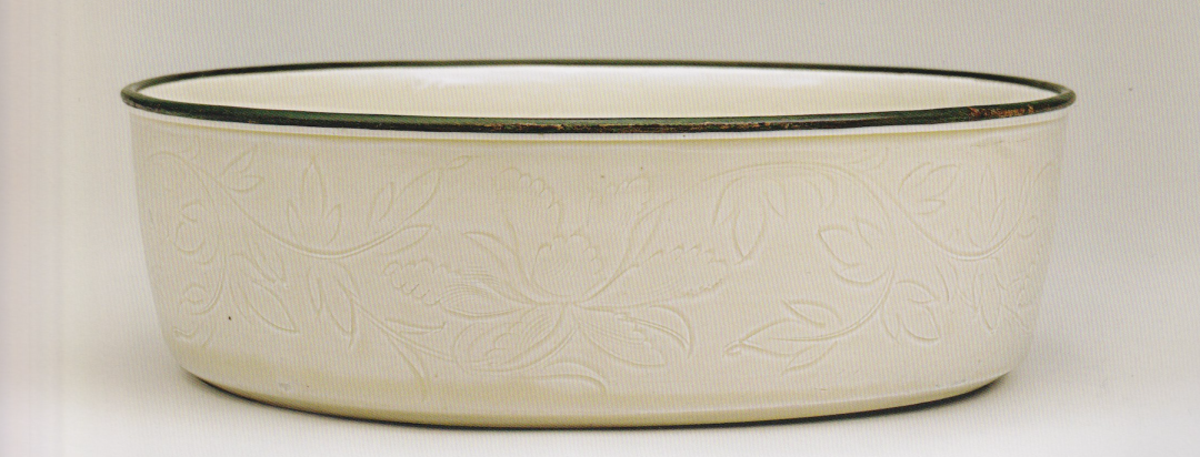 该造型在定窑存世品中甚为罕见。此盆内、外壁及内底刻牡丹纹,花瓣部分采用篦划装饰,外底满釉。1086 ~1127年,定窑窑工发明了具有革命性意义的烧造技术覆烧(即器物上下颠倒以口沿支烧),并采用阶梯式匣钵。这种烧造方法通过一次烧造更多数量的器物而节省燃料,但美中不足的是,为防止倒放瓷器的口沿与匣钵在窑火中相黏,装窑前需要将口沿部分的釉刮去一圈, 烧成后口部无釉成为所谓的“芒口”而显得粗硬。为了掩盖缺陷,工匠们将铜片切割并加热,以铜镶口来修饰粗糙的边缘,既实用又美观。据史料记载,金属镶边事实上也提升了定窑器的价值。得益于丰富的瓷土和煤矿资源,加上便利的水路交通利于运输货物,定窑的烧造从8世纪早期几乎无间断地一直持续到14世纪中期。