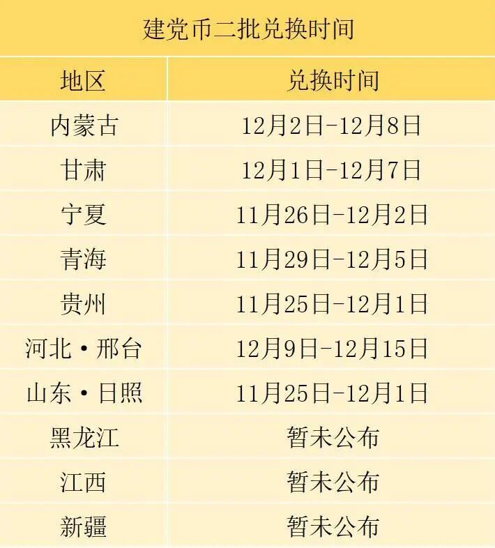 此前有10个地区建党币二批延迟兑换,目前贵州、宁夏、青海、甘肃、内蒙古、山东日照、河北邢台等地区,公布了建党币二批新的兑换时间: