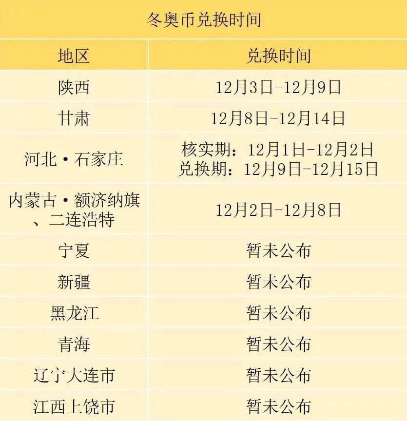 冬奥会纪念币延迟兑换的地区中,陕西、甘肃、河北石家庄以及内蒙古额济纳旗和二连浩特市,也公告了冬奥币新的兑换时间: