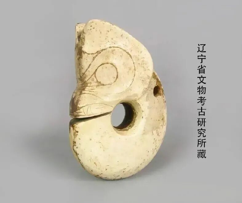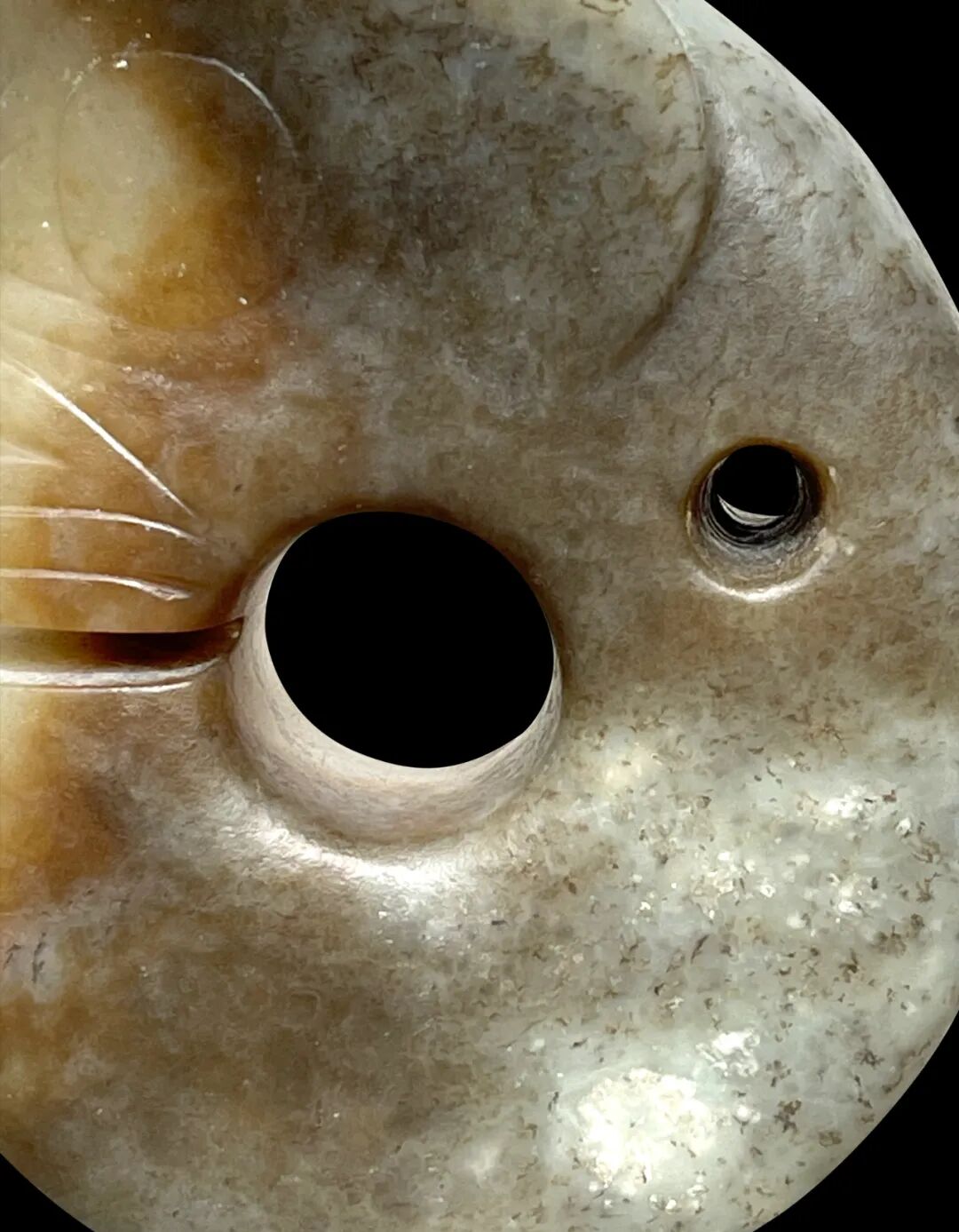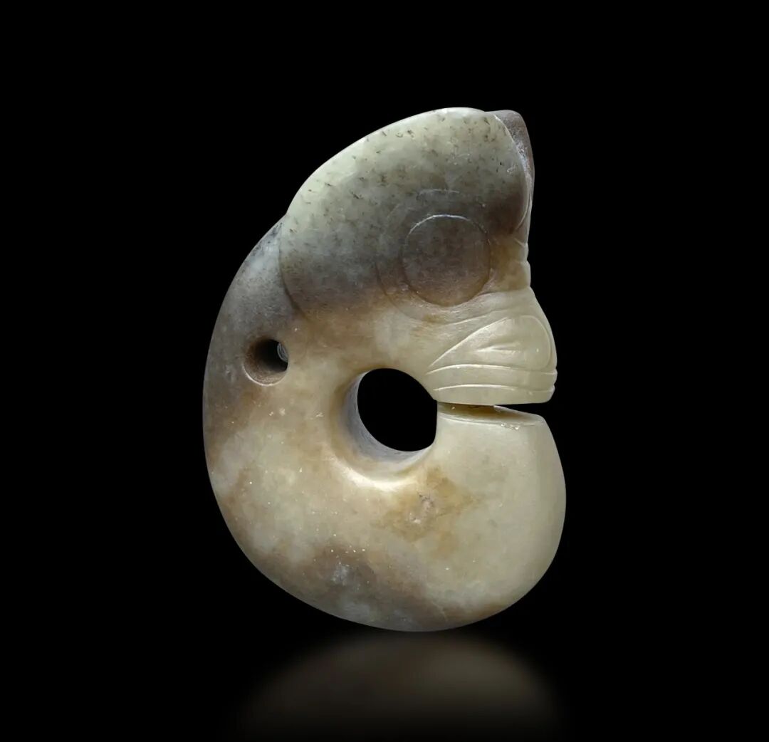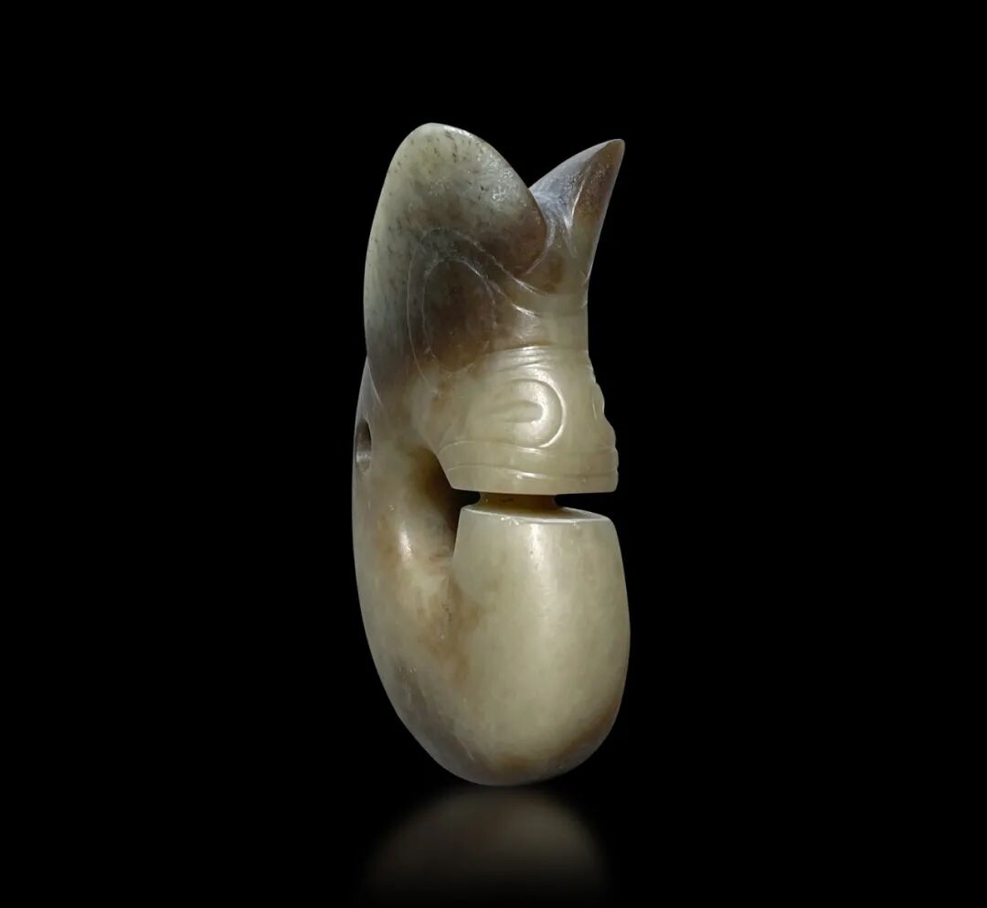 红山文化距今已经有5000-8000年的历史,红山文化玉器非常的精美,其中最为著名的就是玉猪龙,这件玉猪龙头部分开状呈黄褐色,通体白色黄褐色表面温润,自然老化痕迹明显,尾部扁平,与口部相对,颈部有打对孔,阴刻线条刻画眼睛生动,纹饰线条优美,用以祭祀之用,参阅《中国玉器图典》P52,53。杨伯达编著《中国玉器全集上》P20-21。参考2019年3月21日佳士得拍卖红山文化玉猪笼成交价格220多万美元。