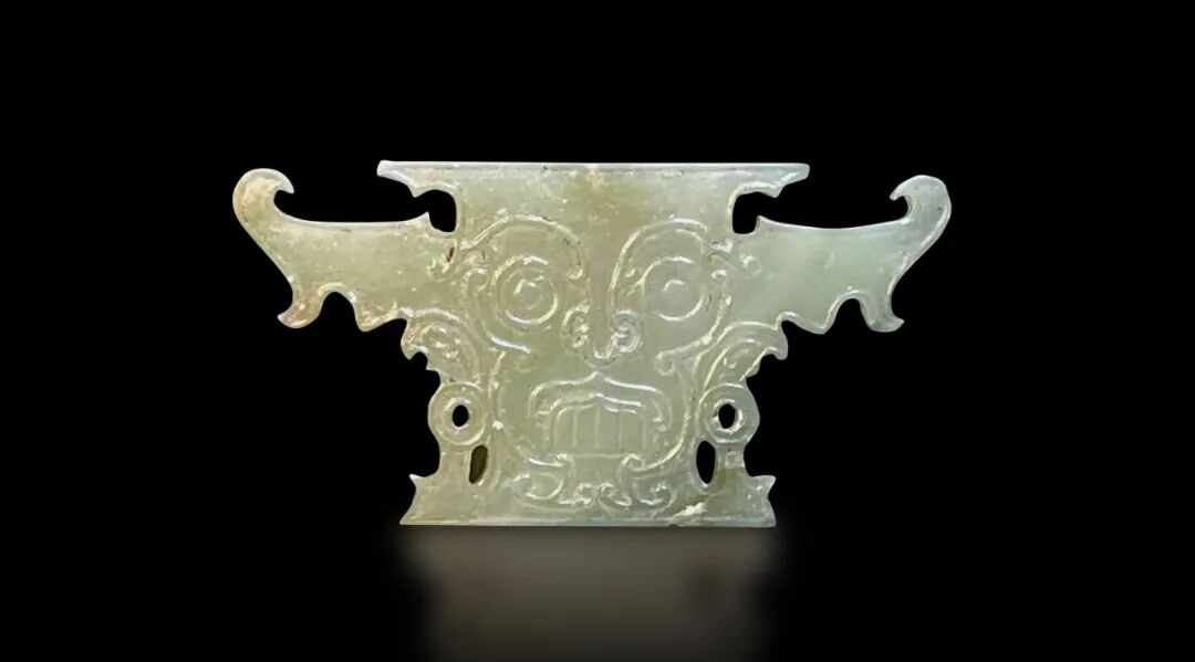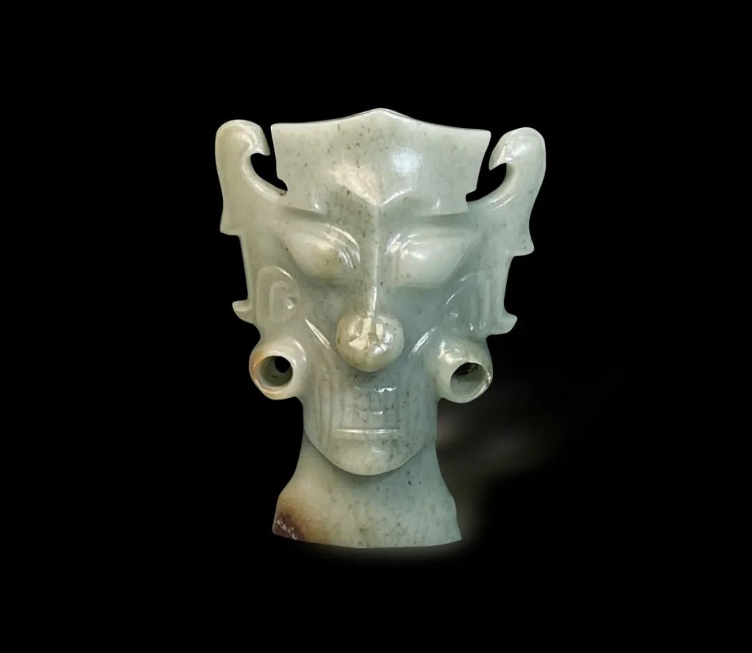 石家河文化距今5000-4300年前,1987年初次发现于湖北省,天门石家河,当阳登处,遍布湖北全境,此玉佩玉质青白如脂,五官清晰、匀称,耳朵为一对飞鸟,耳垂部穿孔,口中露出两排牙齿。参考:一件石家河文化玉人头像,谭家岭出土。