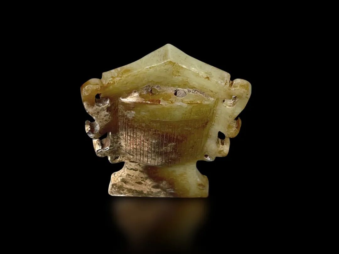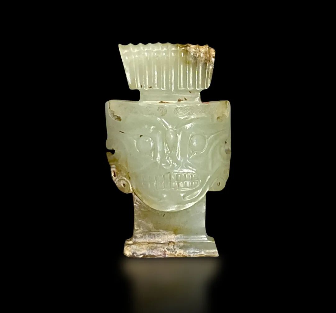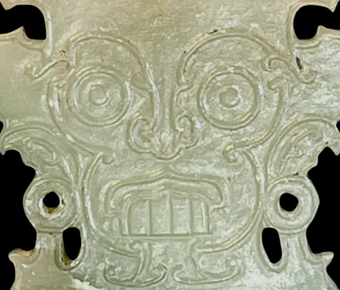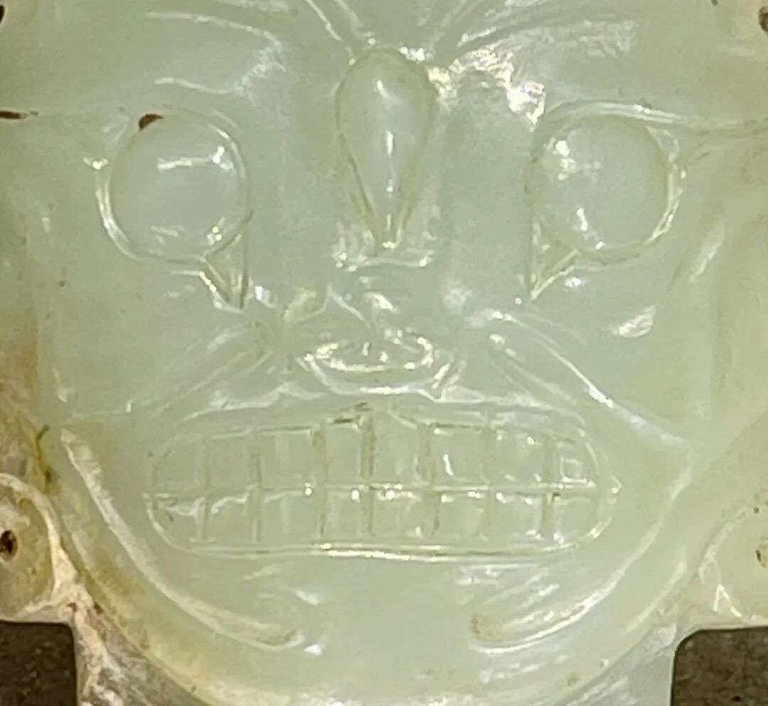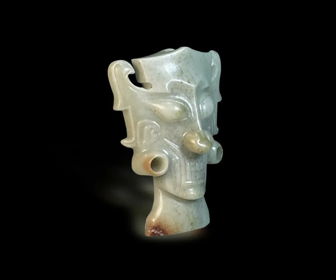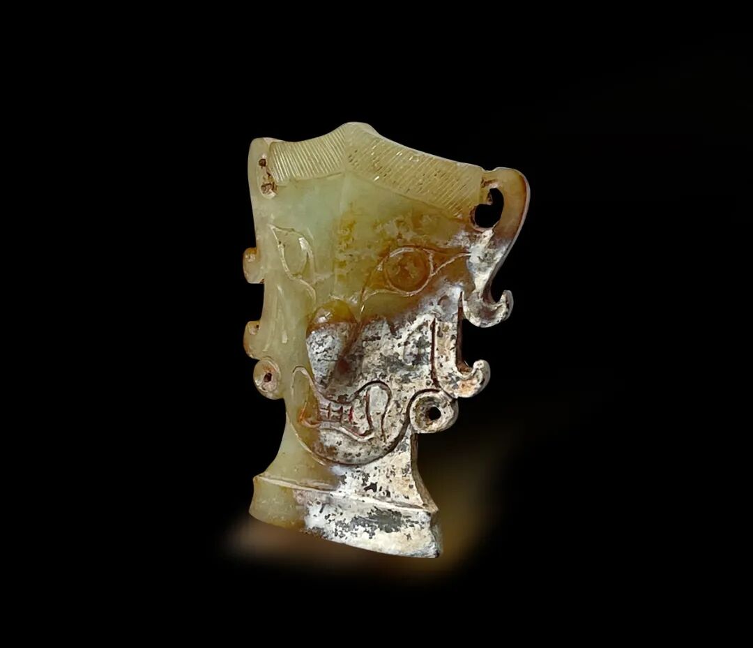距今5000-4300年前石家河文化1987年发现于长江中游地区,此件玉佩十分特殊,双耳似羽翅,联于双目,玉质如脂,呈黄褐色,表面布满鸡骨白色沁色,自然老化痕迹显而易见,佩戴头饰,鼻子宽大,露出两排獠牙。