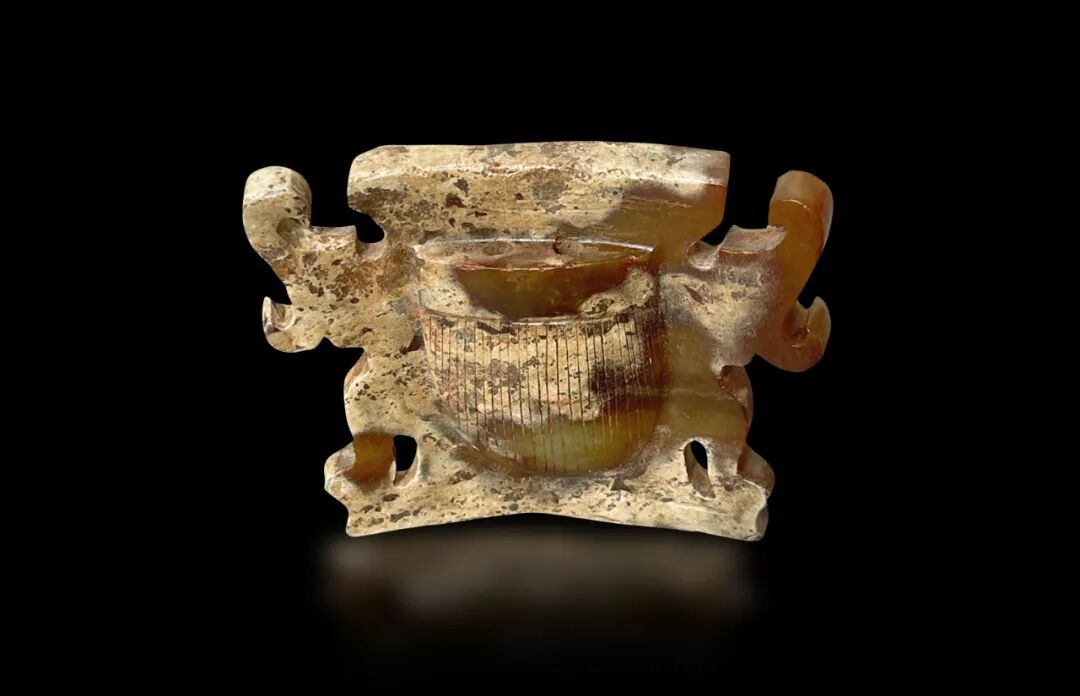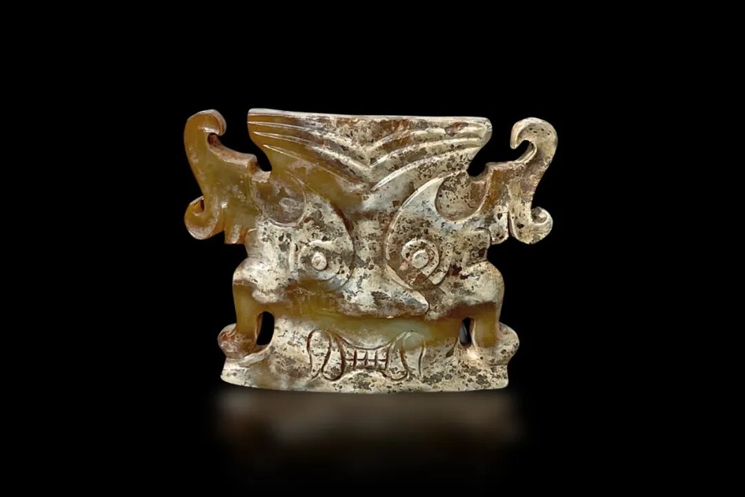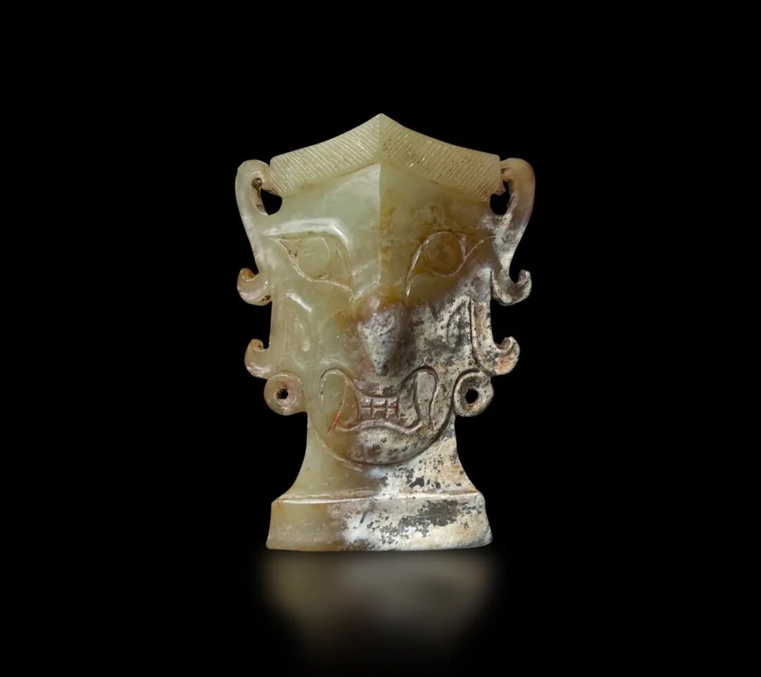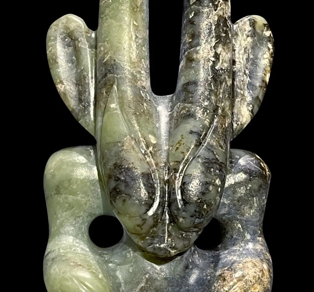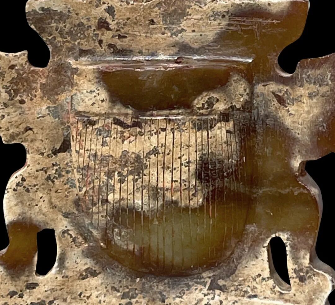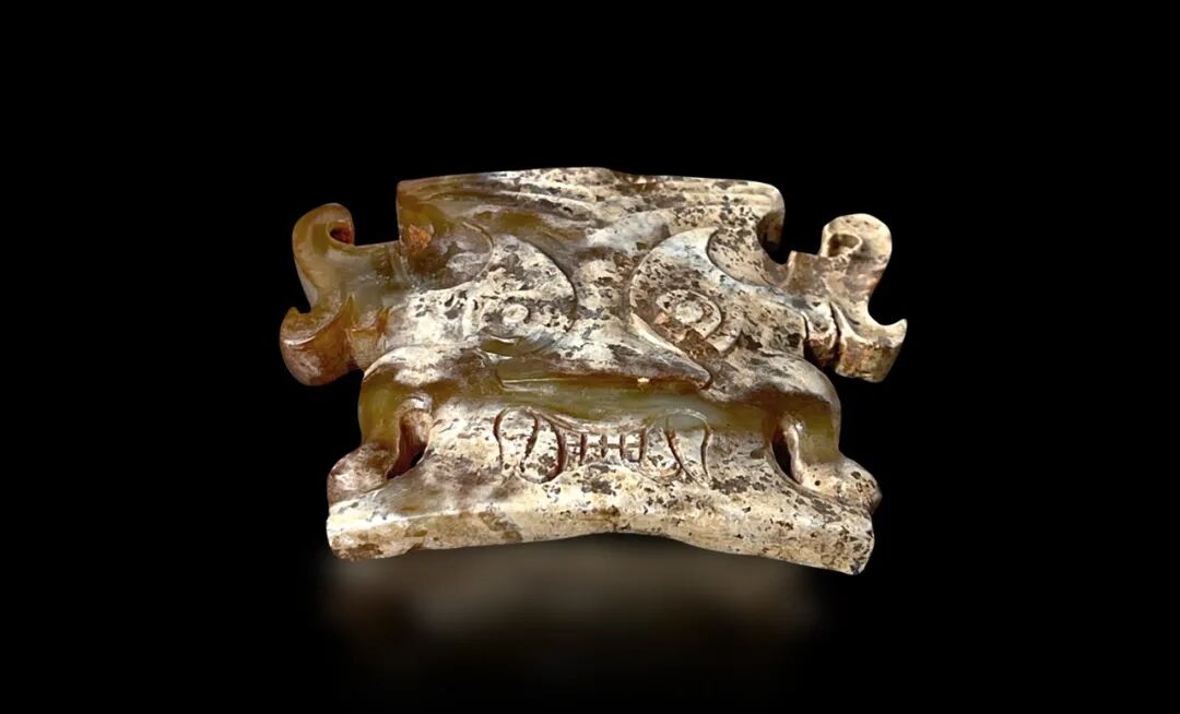 距今5000-4300年前石家河文化1987年发现于长江中游地区,此件玉佩十分特殊,双耳似羽翅,联于双目,玉质如脂,呈黄褐色,表面布满鸡骨白色沁色,自然老化痕迹显而易见,佩戴头饰,鼻子宽大,露出两排獠牙。