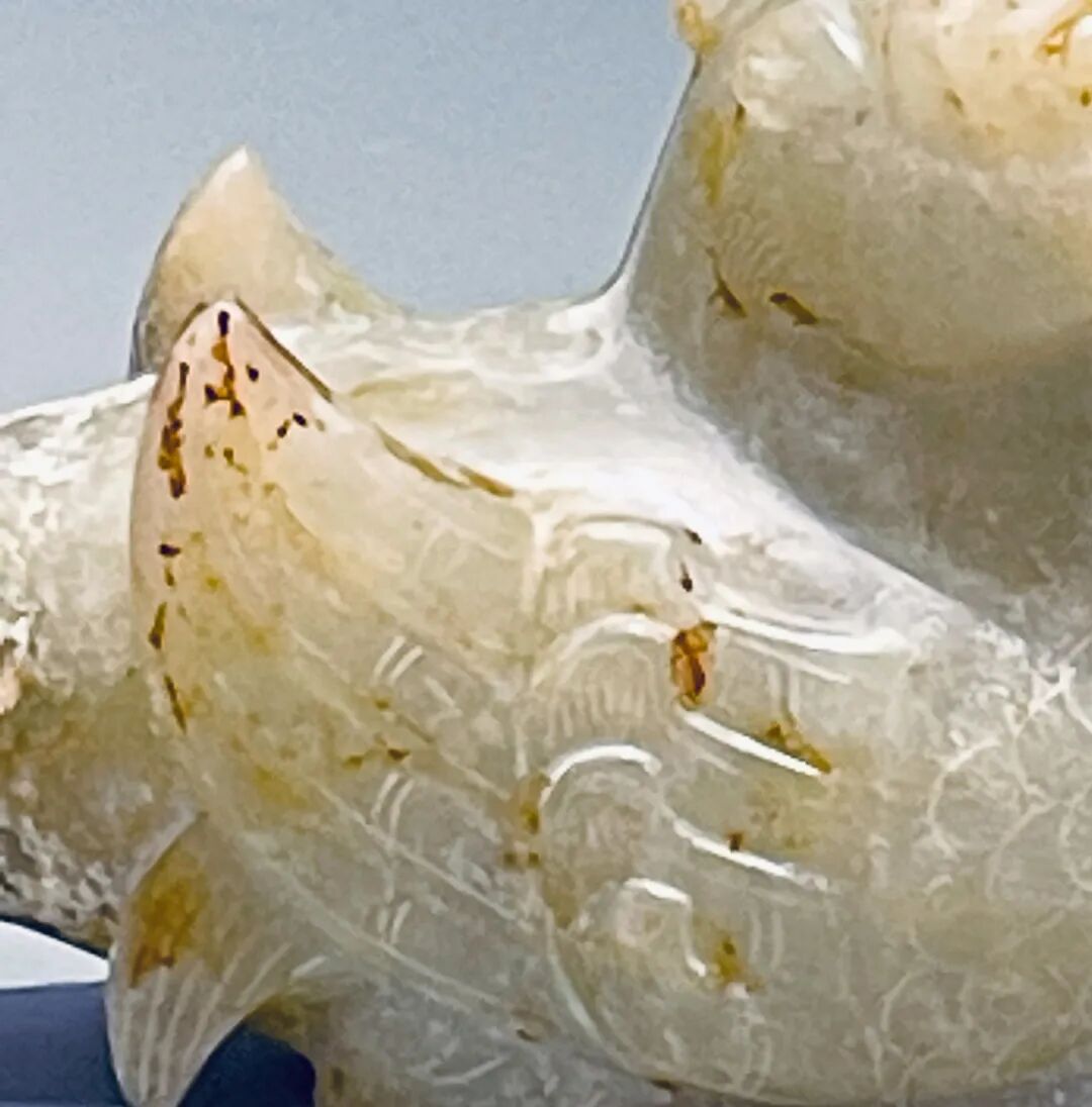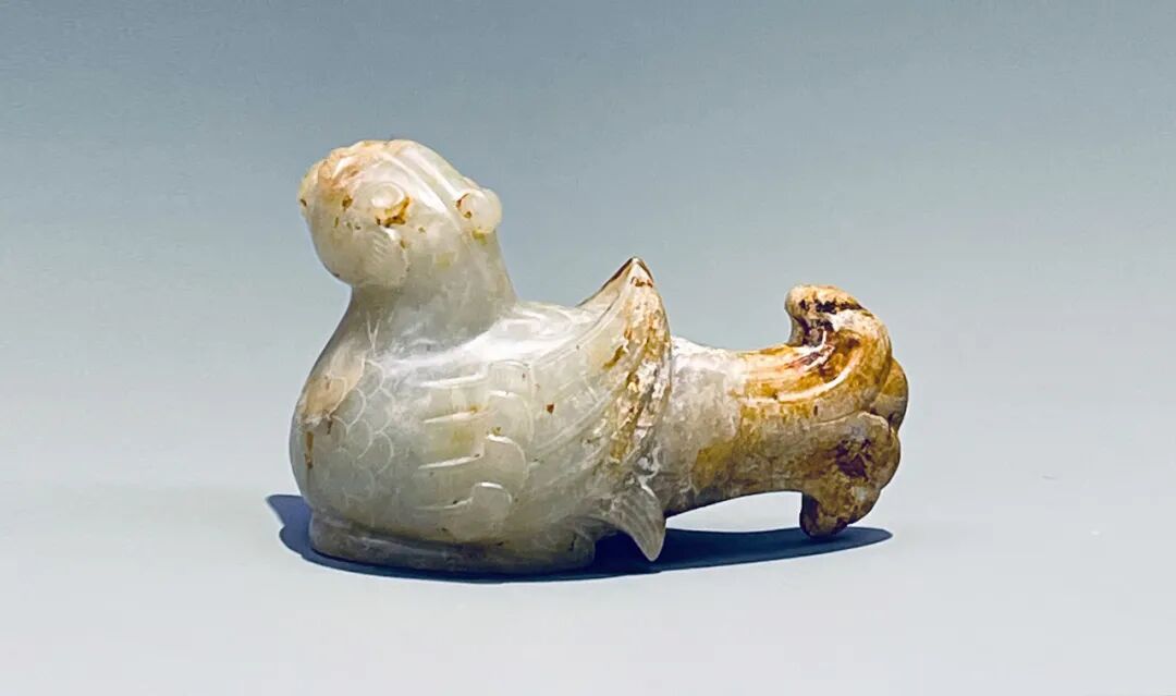 此见凤鸟以上等和田白玉为料,玉质洁白如脂,玻璃质感强烈,通体以圆雕,阴阳刻法等多种技法,雕刻了抽象的凤凰造型。沁色表象丰富,深入肌理,形态生动,造型古朴典雅,十分难得。