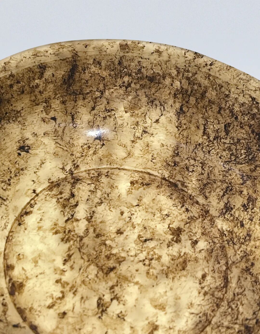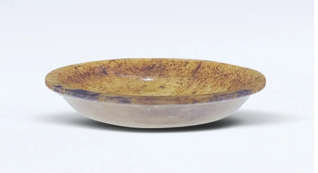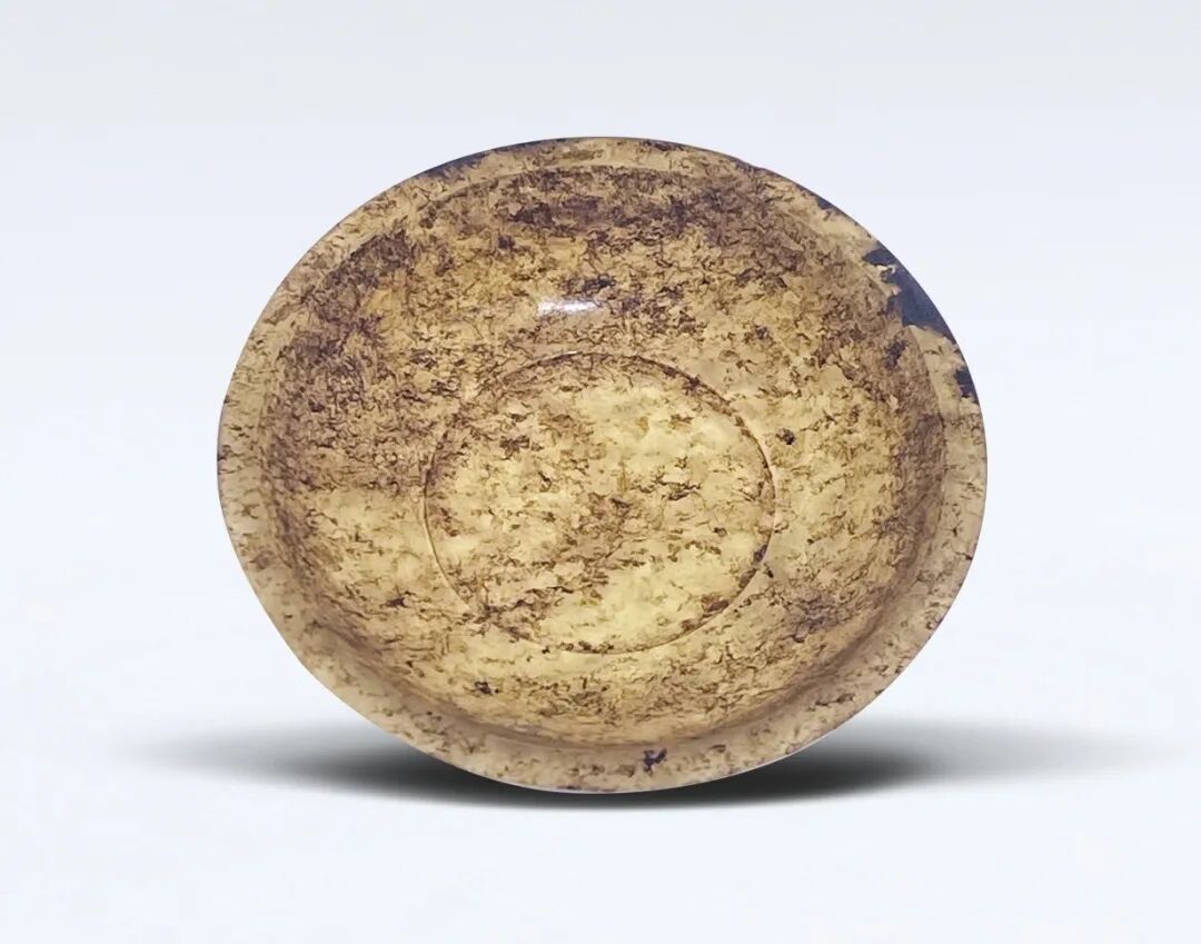 碟沿呈向外折方形,白玉褐色沁,玉质细腻温润,雕工精细,器型端庄,外侧阴刻螭龙纹,线条流畅,雕工精细,极为优美。此种造型十分稀有。
