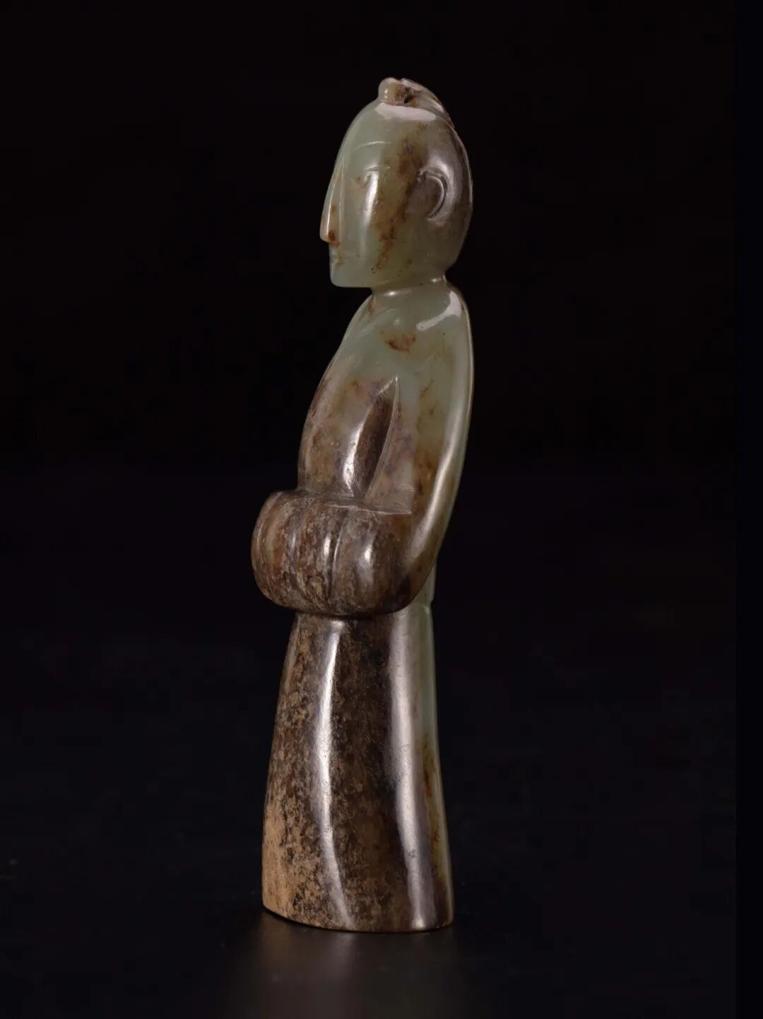 此件玉人青白玉质,下半身受沁呈黑褐色,玉人屹立,神态恭敬,双手合握袖内,垂放在腰间,整体比例匀称,造型优美,雕工流畅圆润,汉代时期的这种圆雕立件玉器十分稀有珍贵,等级也非常高。参阅:《中国玉器全集》卷4 秦汉南朝 P178。