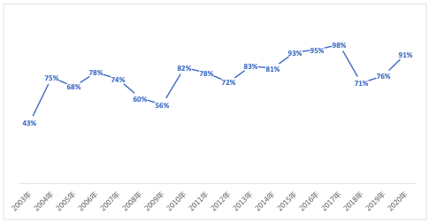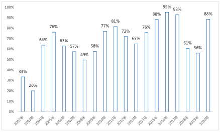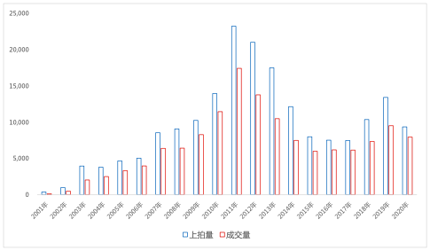 ·2002年-2020年光绪元宝拍卖市场成交率,来源:雅昌艺术市场检测中心(AMMA)