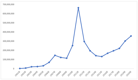 ·2004年-2020年 孙中山头像钱币在中国市场的成交量,来源:雅昌艺术市场检测中心(AMMA)