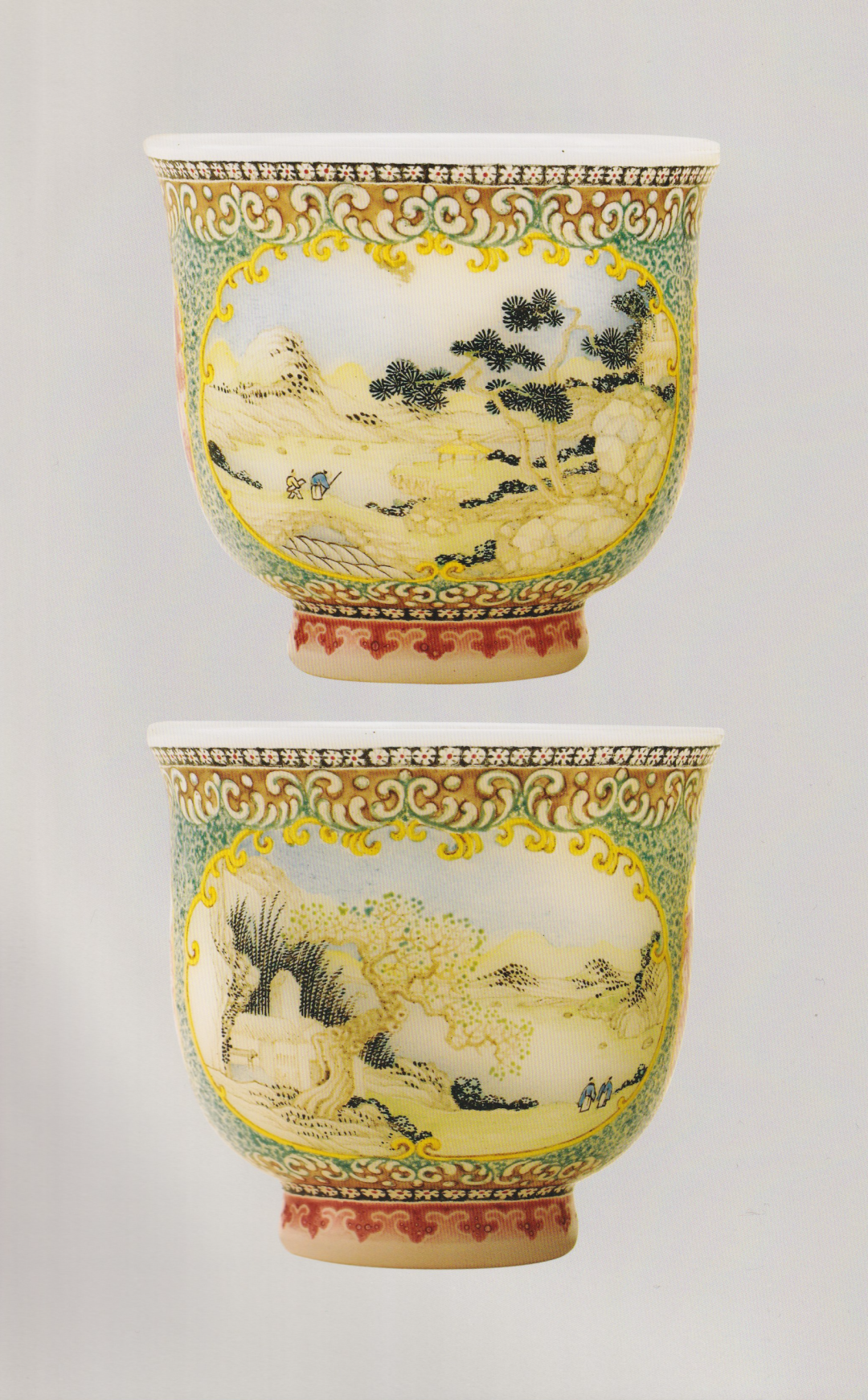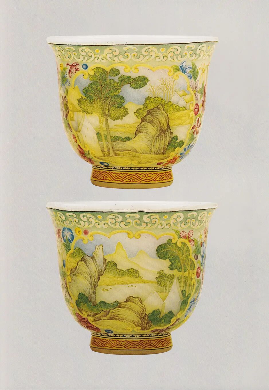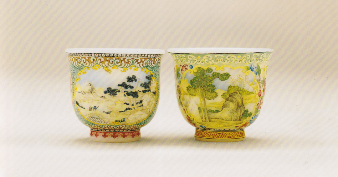 在紫禁城造办处制作的料胎珐琅彩器,远比同一作坊内制作的瓷胎画珐琅器稀少。中国玻璃器的制作技术一直受到外国工匠的影响,清宫内的作坊即受到欧洲耶稣会传教士的监管。虽然这对不透明的白色料器酒杯的造型是源于同时期景德镇御窑厂生产的官窑瓷器,但珐琅彩的装饰却是参考了欧洲的绘画形式。在右图的酒杯上描绘的风景图,使用了西洋的透视法。左面的杯中绘两幅山水风景图,每幅之中都有两位绘制细微的人物;山水图景之间则有玫瑰红料所绘小开光。这只酒杯的边饰绘满细小花朵,这种技法曾在意大利威尼斯的玻璃工匠之间非常流行。两件杯底均带蓝料四字乾隆年号款。