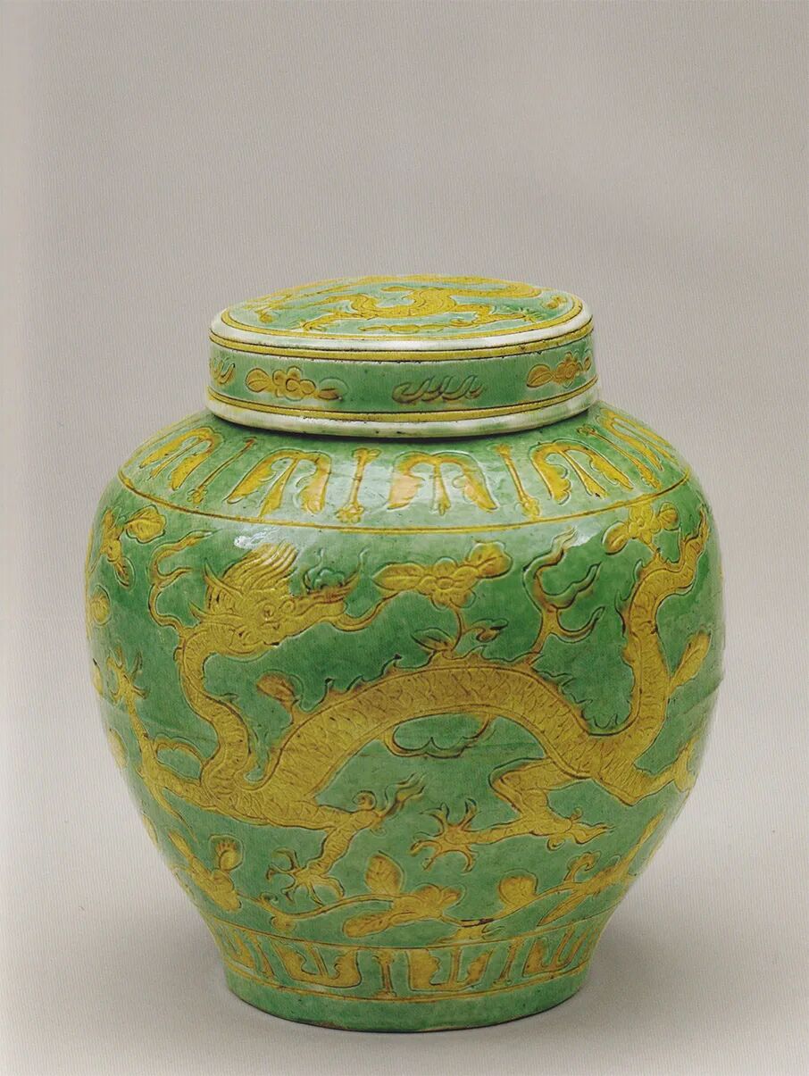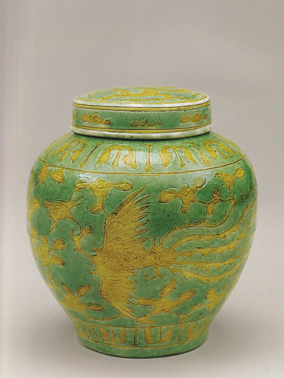 窑工在已干未施釉的涩瓷胎罐身的一面及盖面上各刻划一条五爪龙纹,在罐身另一面刻划一只带五条长流羽尾的凤纹,龙凤周围装饰有花枝。景德镇窑工烧制此罐时使用了一种新技术,先将刻划好龙凤纹未施釉的瓷罐素烧为涩瓷,然后直接将黄、绿釉彩施于涩瓷胎上再二次烧成,而非先罩一层底釉再在釉上施黄、绿彩。首先施的是黄彩,然后施绿彩,该施彩顺序是从纹饰的边缘部分绿彩叠盖于黄彩之上而得知的。在明清两个朝(1368 ~ 1911年),龙与风象征皇帝与皇后。罐底书青花六字万历年号款。尽管窑工们早在200多年前的永乐时期就尝试过黄绿彩瓷器的烧制,但在无底釉的涩胎上直接施彩,则是这个时期的创新。