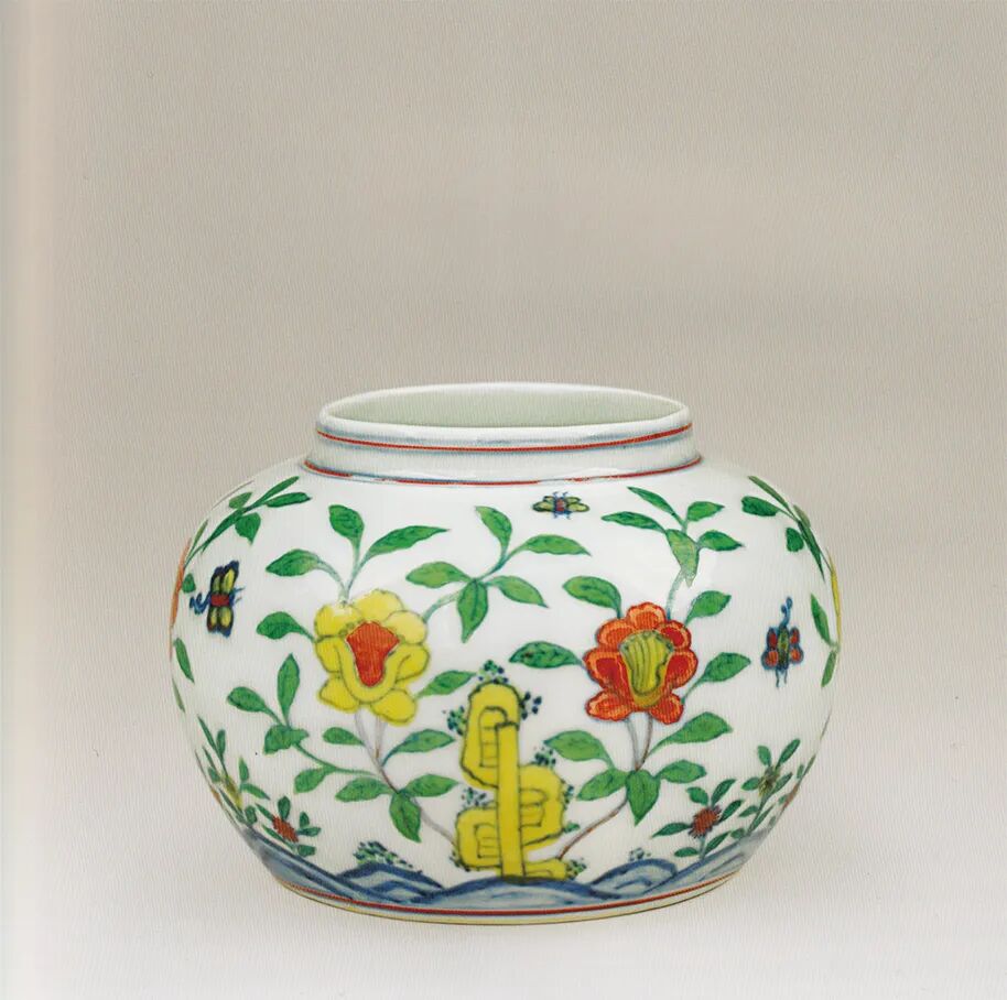上彩料,最后送进低温隔焰窑中烧成。这种特殊的二次烧窑技术在景德镇的15世纪早期被首先使用,但到成化时期臻于纯熟。这种扁圆形的罐子极其罕见,绘有三组重复的花纹,分别以酱紫彩、绿彩和黄彩绘染的湖石,每座湖石两侧都绘有茶花和蝴蝶。罐底书青花六字成化年号款。