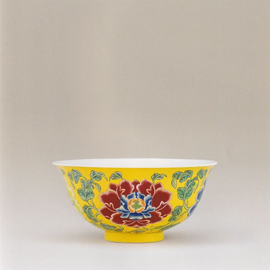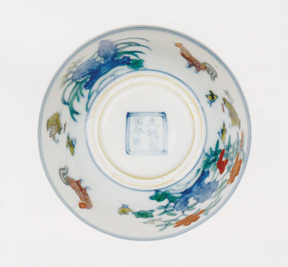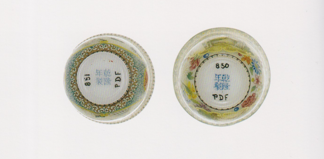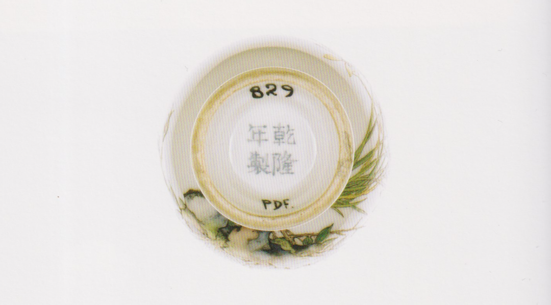 这对品质卓越的碗非常罕见,在北京与台北故官博物院的皇家珍藏以外极少发现。窑工们在景德镇御窑厂烧制出白瓷胎,而北京皇宫的宫延画师们在白瓷胎上加彩作画,再放入低温炉内二次烧成。过去的学者和收藏家们称这种顶级品质、在皇宫内加彩的瓷器为“古月轩”器。虽然“古月”印章的确出现在这类瓷器的某些器物上,但最近的研究显示清宫其实并没有名为“古月轩”的地方,故“古月轩”器这一术语逐渐不再使用。现在,它们更多地被称作“珐琅彩”。这对碗底部带蓝料双框四字“雍正年制”款。