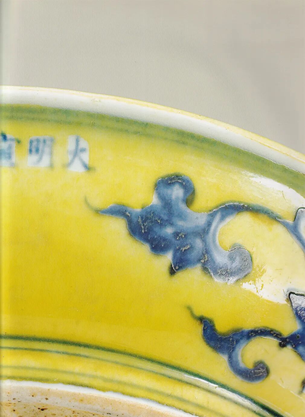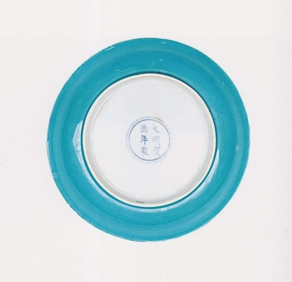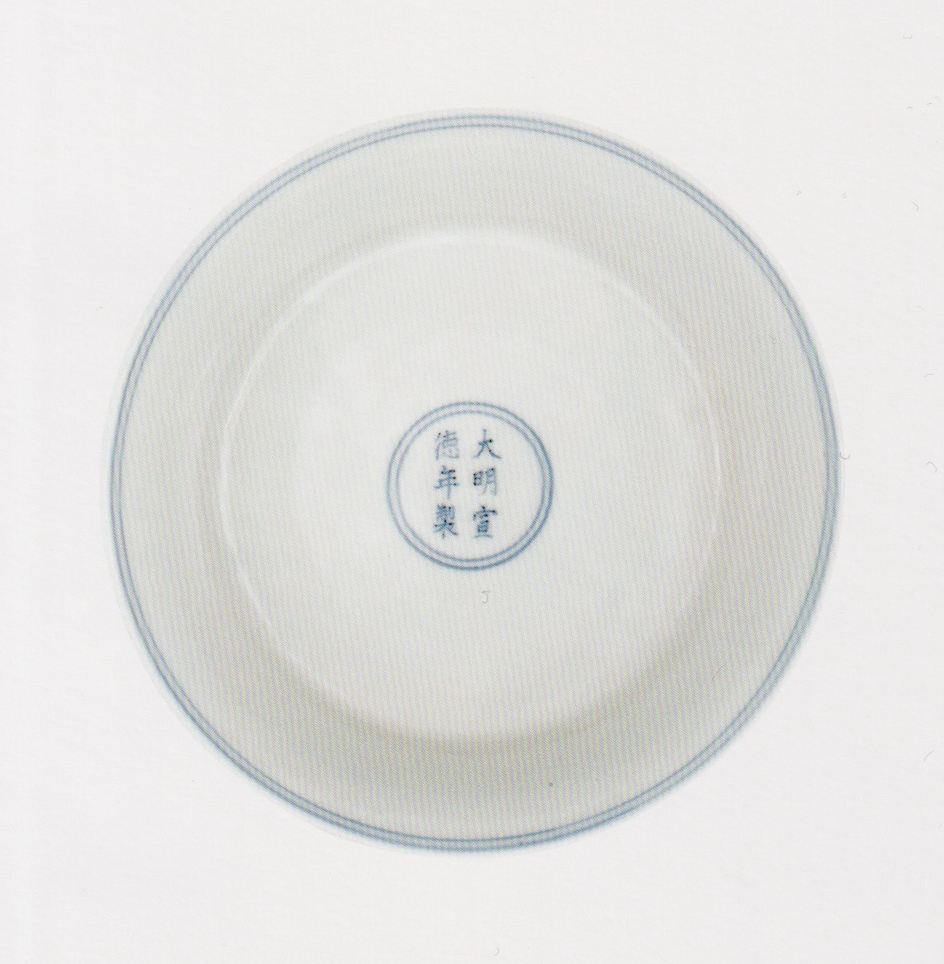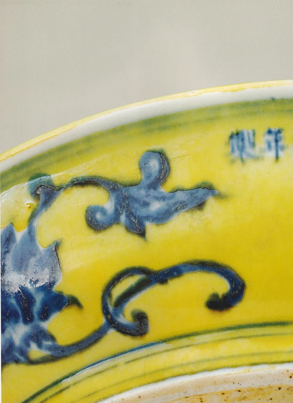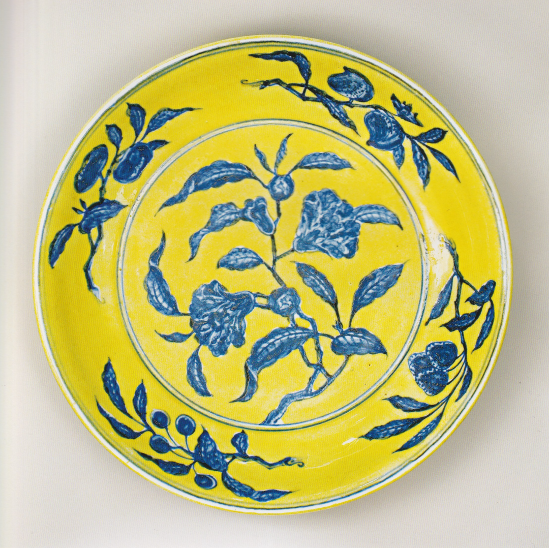 这件瓷盘用于装饰的釉下青花,发色并不均匀。氧化钴在有些局部烧结呈黑蓝色,有些局部则呈浅灰蓝色。盘心绘一束折技石榴花果,浅弧壁上再绘四组折枝柿子、蟠桃、荔枝和樱桃。花果的技干尾端画得粗糙参差,这是一种传统表现形式,表示它们都是从树的枝干上上攀折下来的。较大的叶子被描绘成卷边状,与较嫩的小叶子形成对比。盘子外壁是固定画法的四组青花莲花,盘口沿下书六字宣德年号横款。黄釉釉面如浮在水面上的油脂般呈现隐约的彩光、并随处可见有局部细微的摩擦或刮擦痕,这是使用磨损的痕迹。盘底无釉,带很多微小的铁红色斑点。宣德皇帝的统治仅有短暂的10年,但此时景德镇御窑厂官窑瓷器的产量规模却很大,烧造了数以百万件供宫廷使用的餐具以及祭祀仪式用的瓷器。虽然产量惊人,但瓷釉品质之高、造型之丰富也同样令人惊叹。这种折枝花纹样就是15世纪早期所创,并于以后的一百年间继续生产,又在清朝(1644~ 1911年)再次复烧。