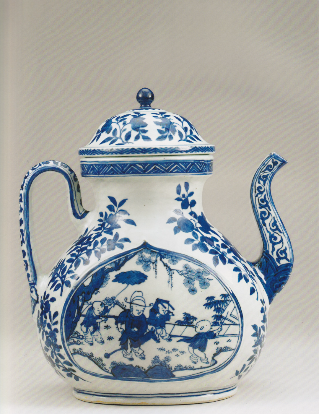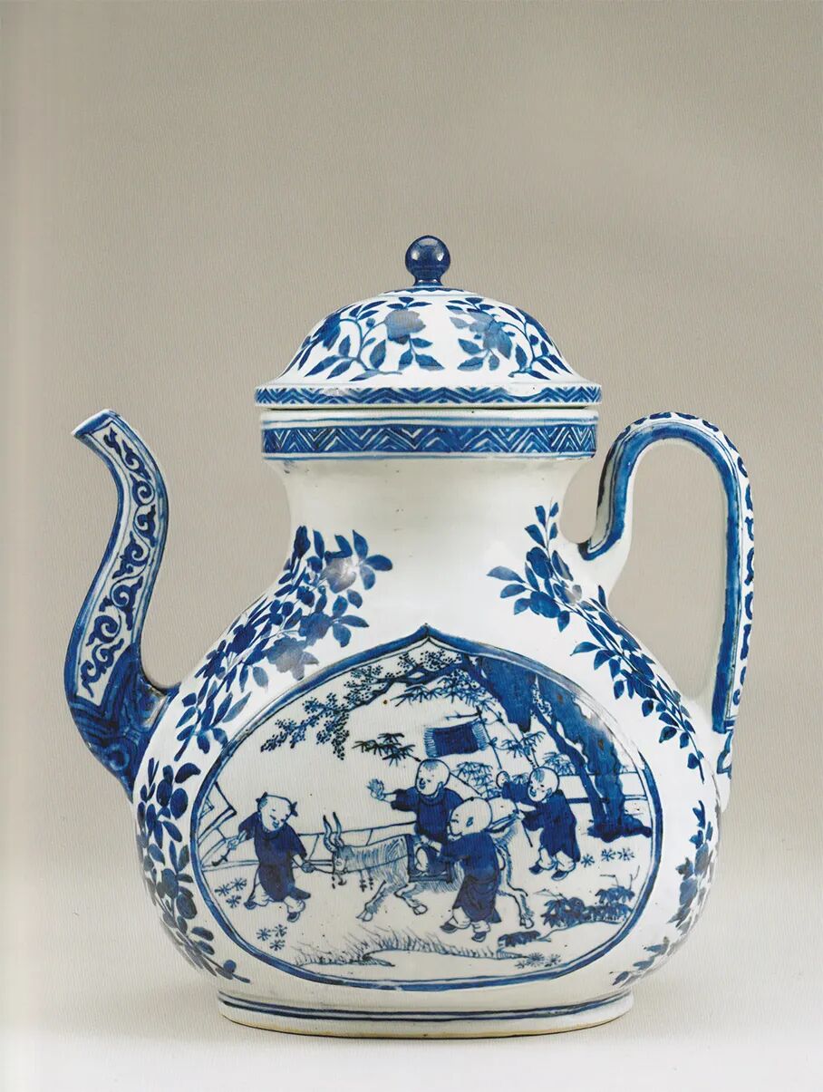 在16世纪下半叶,官窑瓷器上所使用的青花料发色浓重均匀。这种青花料被纯熟地使用在这件执壶上,用以描绘在壶两面的桃形开光中的庭院婴戏图。执壶一面绘一个面带微笑、头戴官帽骑竹马的小男孩,在扮演一位官袍加身的大官人,身旁还有三个扮演侍从的小男孩,一个手举荷叶为其遮阳,一个背着为其歇息用的方凳,还有一个手持木棍,走在前面在为骑马官人吆喊开路。执壶另一面绘一个骑着山羊的小男孩,旁边也有三个男孩,一个牵羊,一个随行,一个举旗。此类婴戏图在传统中国风俗画中象征吉祥和多子。壶底书双圈六字嘉靖年号款。